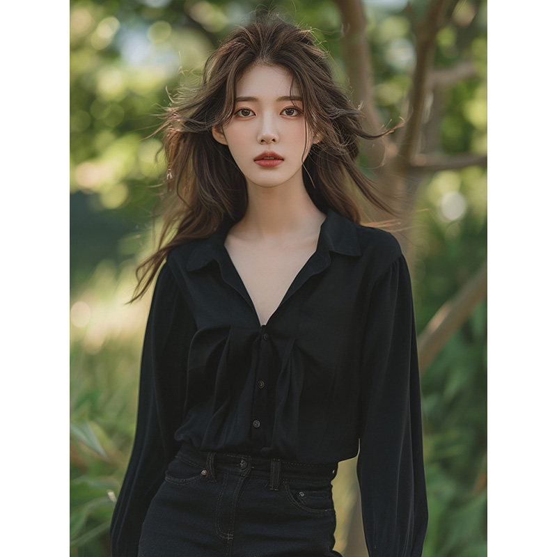 黑色法式V领衬衫女2026年春季新款小个子长袖衬衣轻奢高级感上衣
