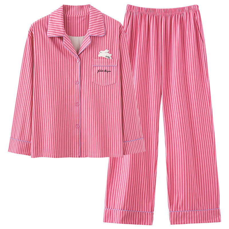 睡衣女款春秋季纯棉长袖开衫条纹可爱卡通兔子秋冬天家居服可外穿
