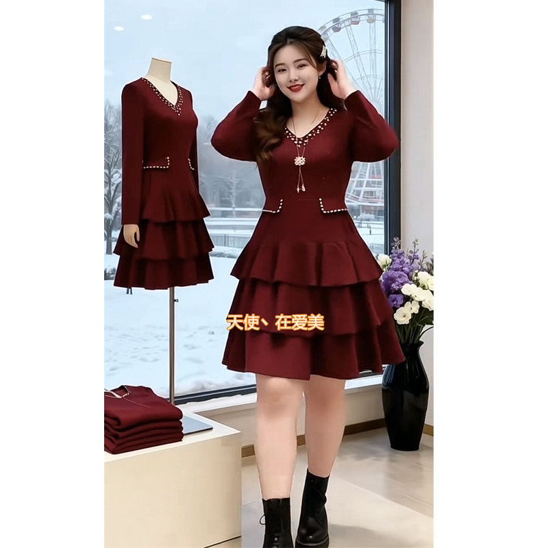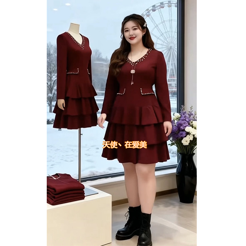 胖mm大码女装春秋蛋糕裙洋气V领钉珠新款优雅时尚收腰显瘦连衣裙