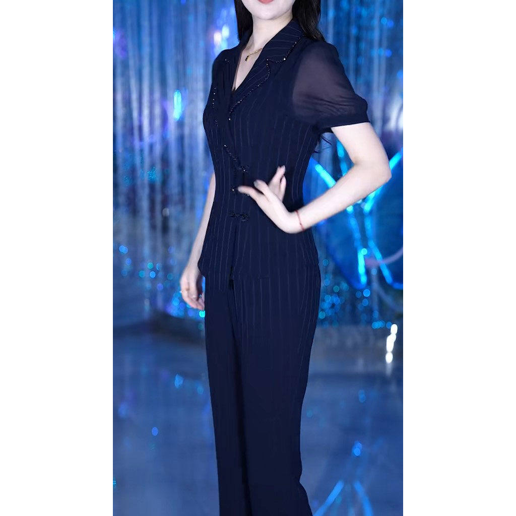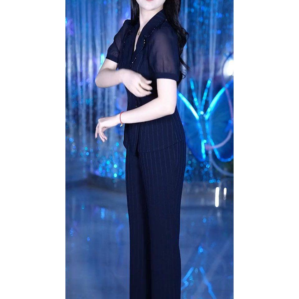 311线报网描述:雪纺拼接盘扣短袖上衣直筒裤两件套装女