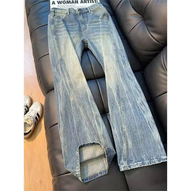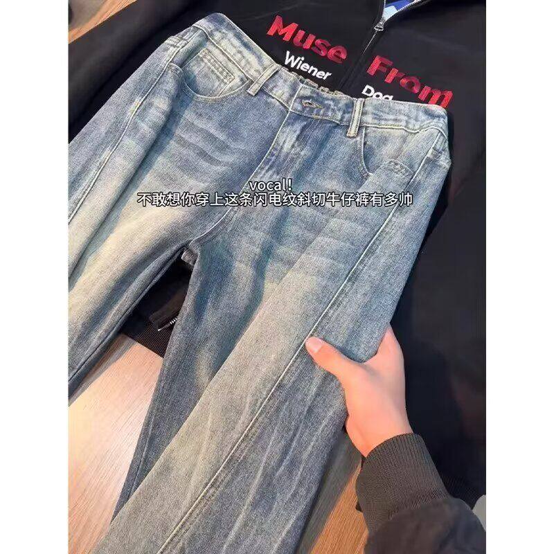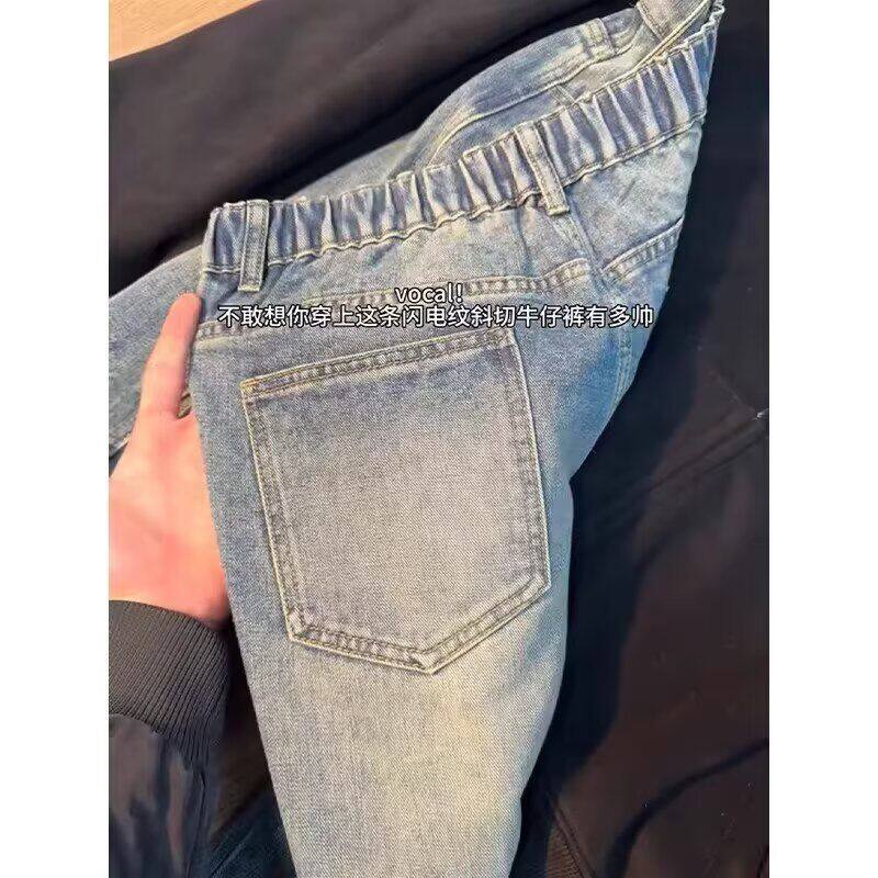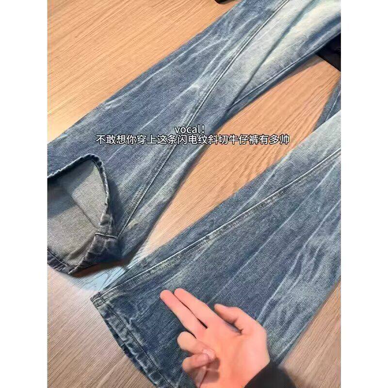 蓝色闪电纹斜切弯刀牛仔裤男款美式vibe潮牌水洗裤子直筒微喇长裤