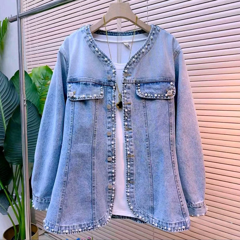 加肥女V领钉珠边牛仔外套欧洲站2026早春新款胖妹妹百搭洋气上衣