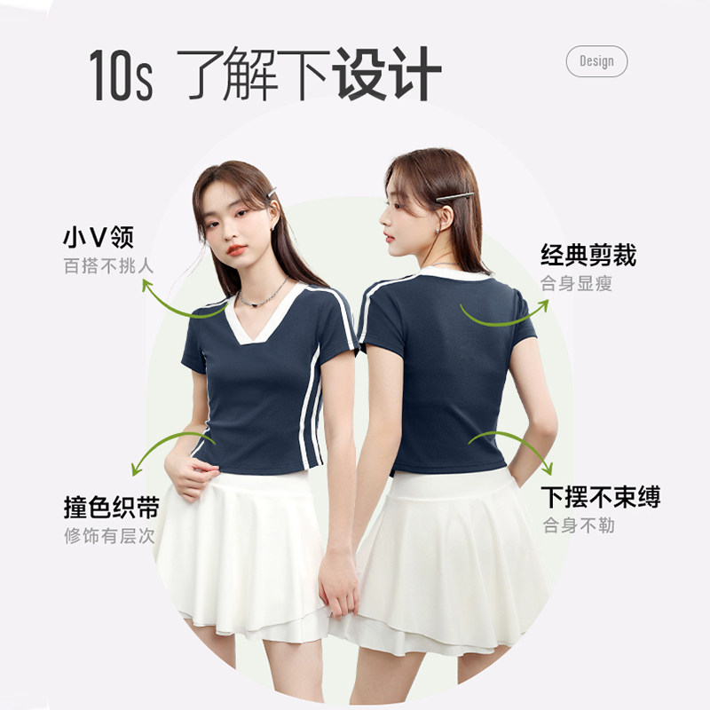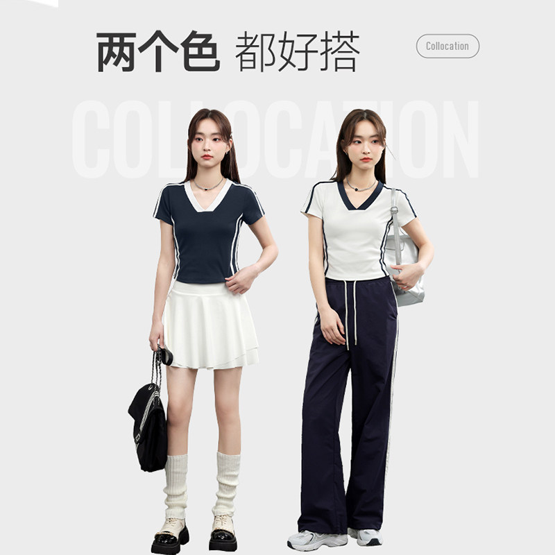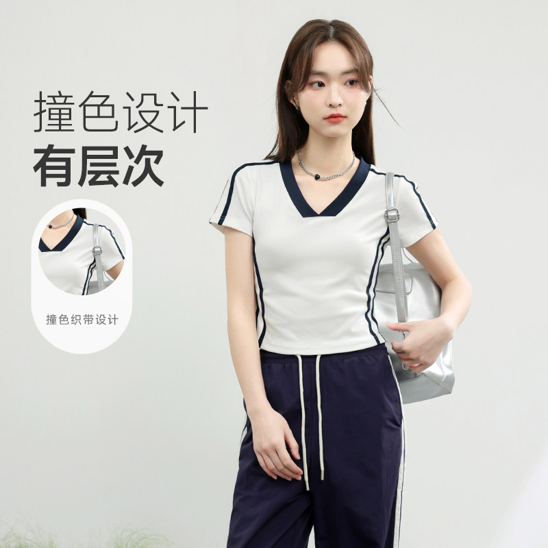 班尼路S&K系列蓝白撞色V领修身短袖t恤女款2026夏季新款美式上衣H