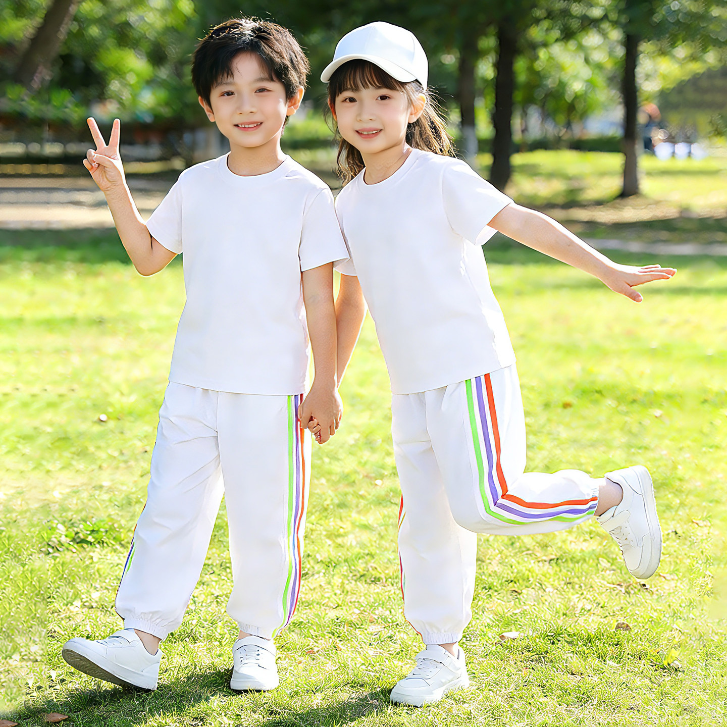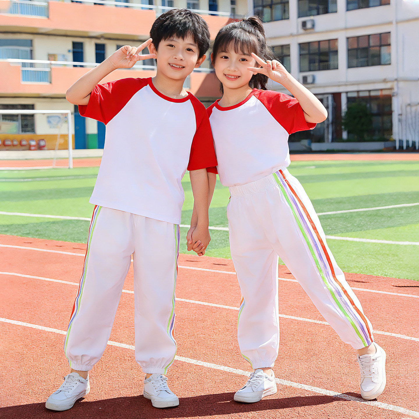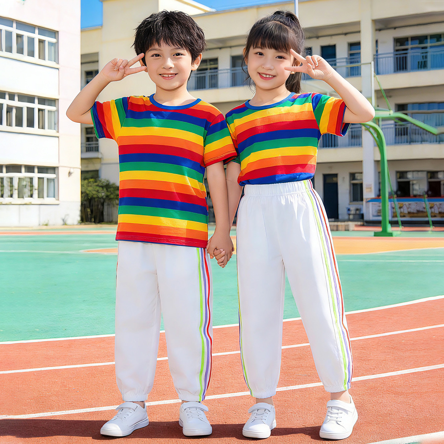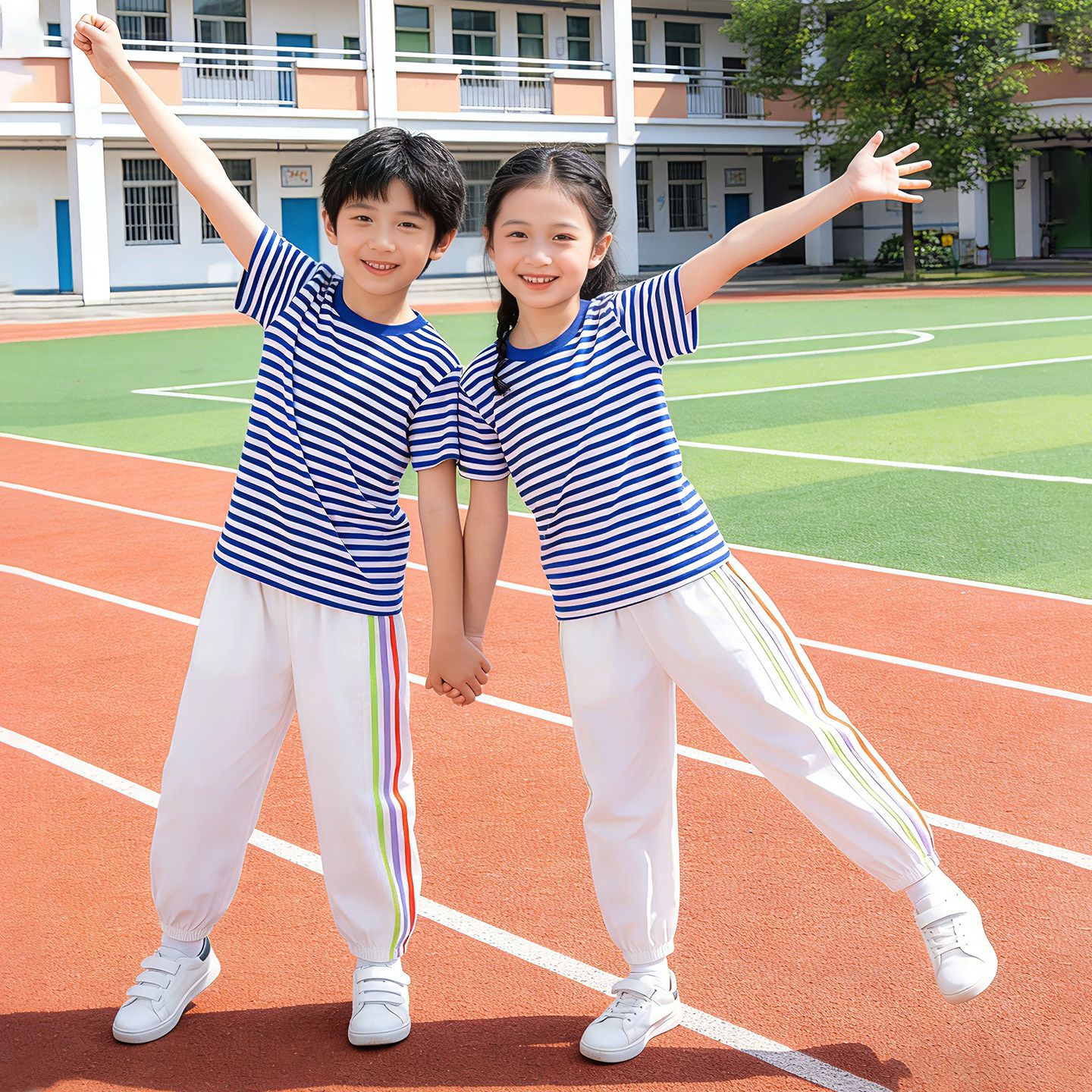 六一儿童啦啦队演出服纯棉 男童女童夏装运动套装2026新款条纹t恤