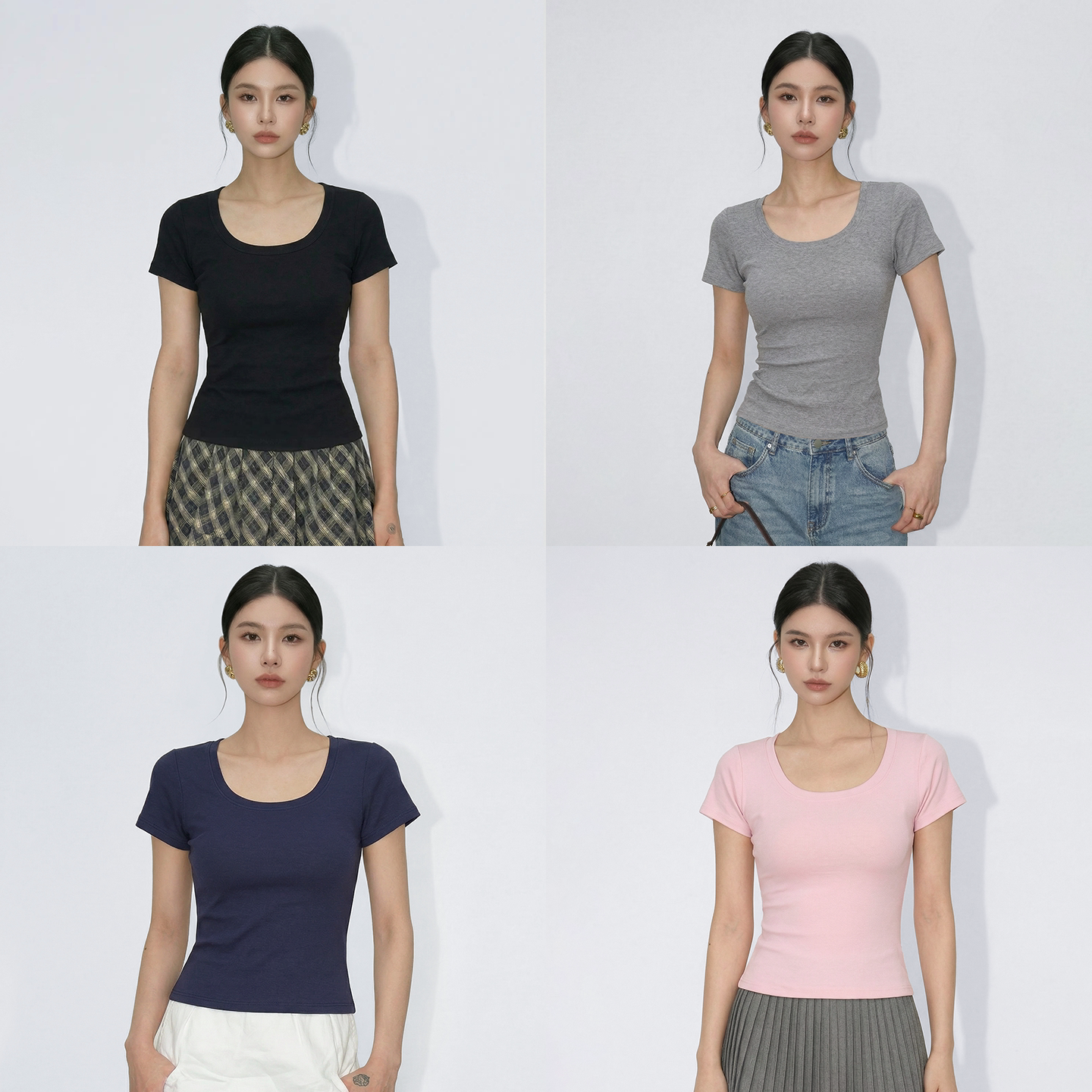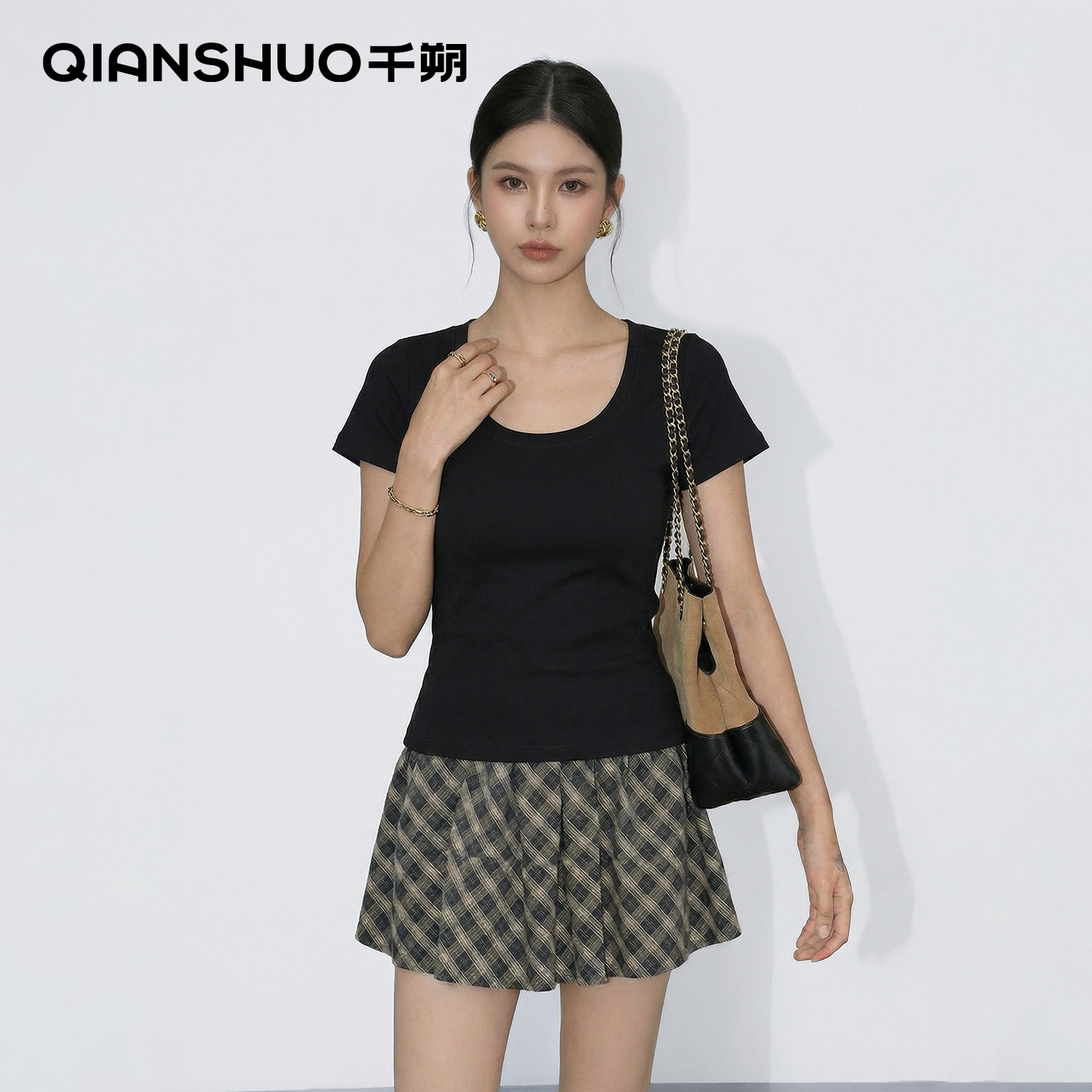 千朔u领正肩t恤女夏季2026新款基础短袖白色打底上衣修身掐腰显瘦