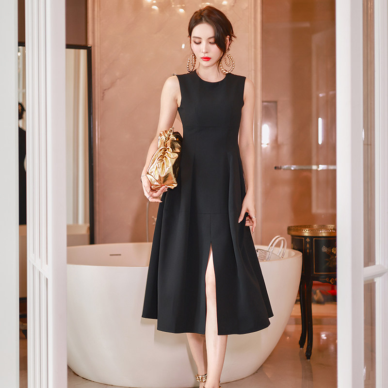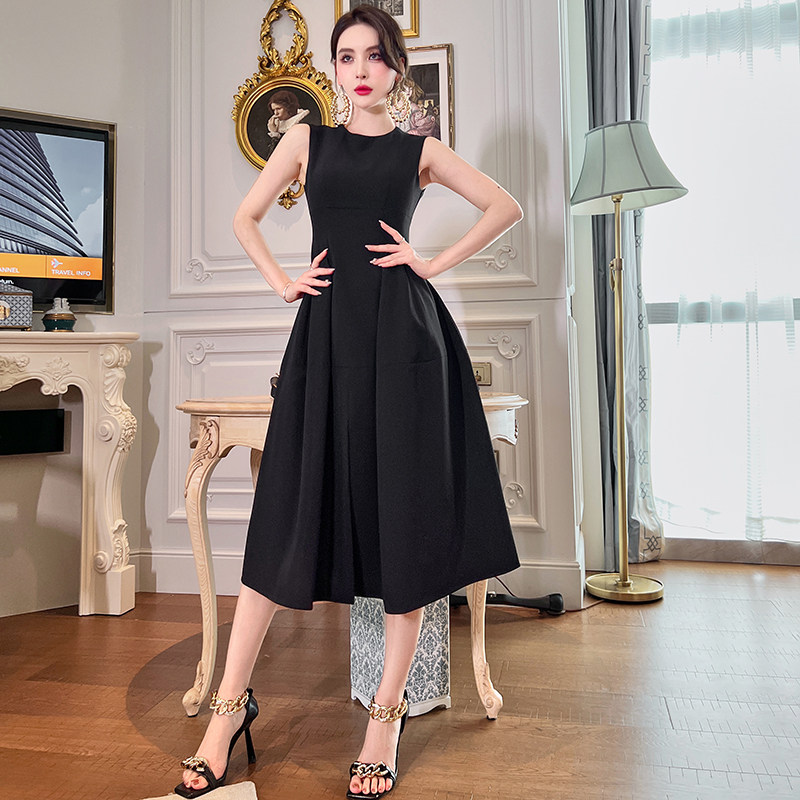 赫本风高级感黑色显瘦无袖连衣裙女秋季新款简约时尚收腰a字长裙
