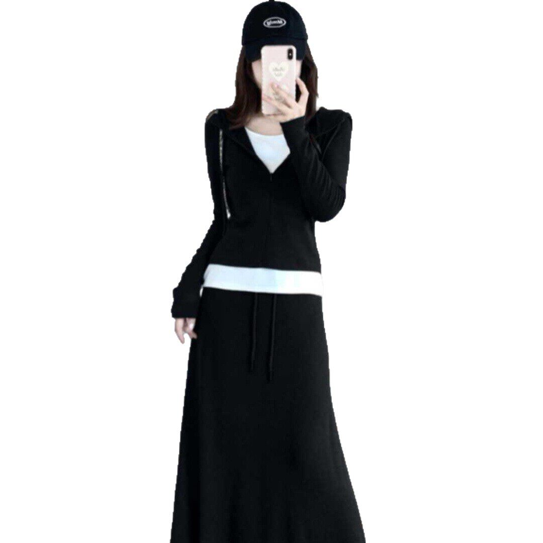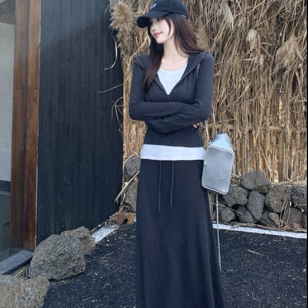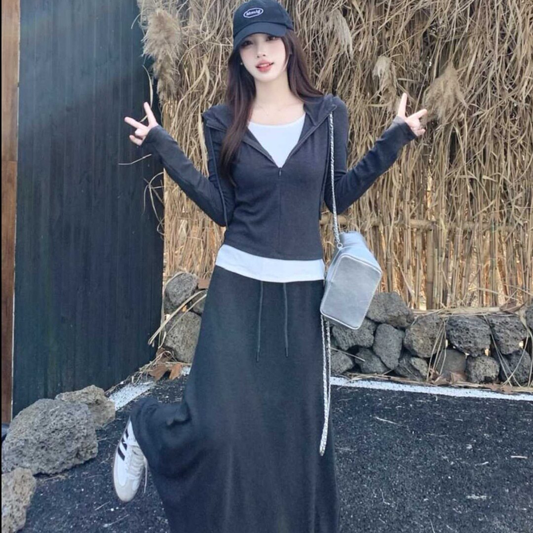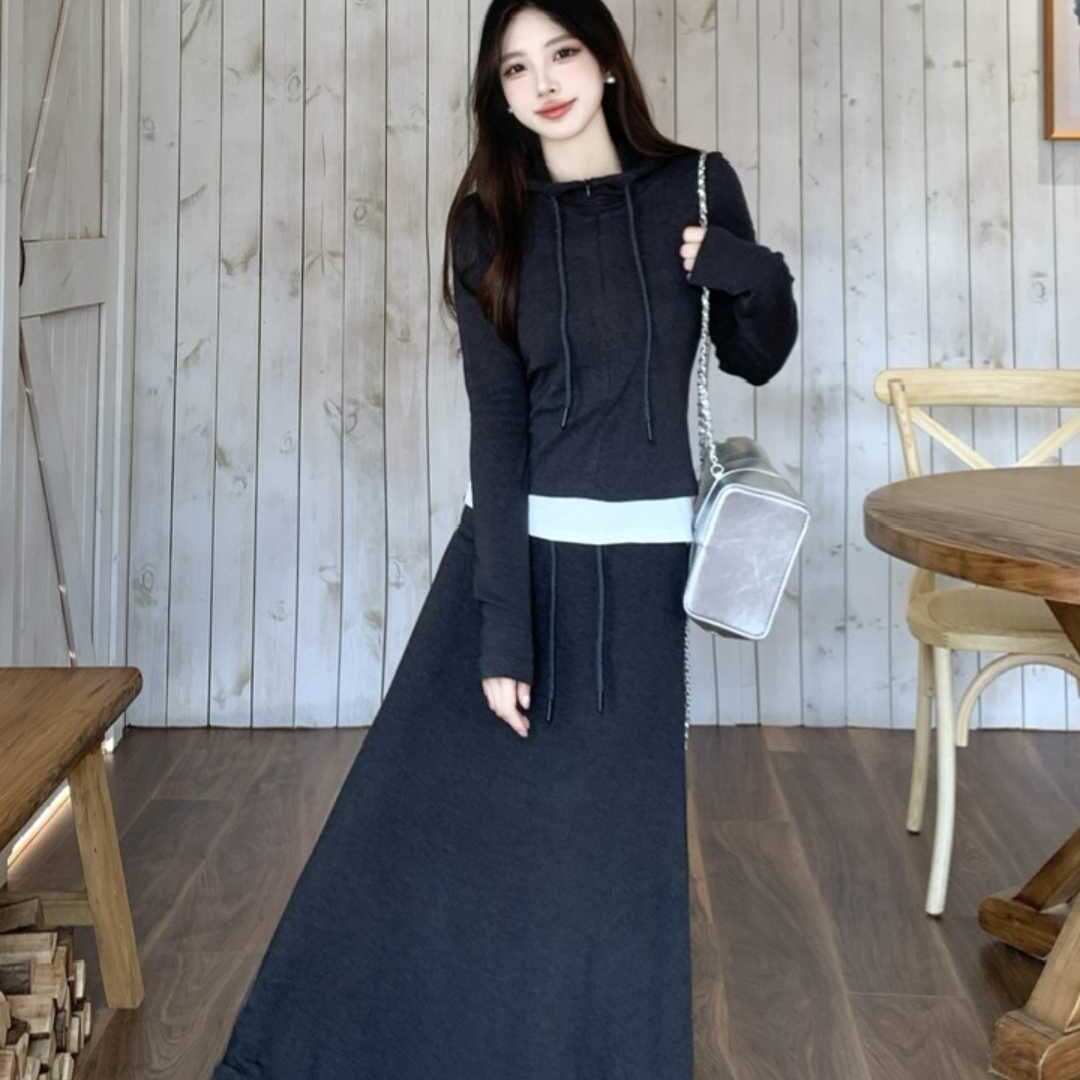 2026春季新款假两件套装女 连帽修身连衣裙 韩系慵懒风显瘦长裙