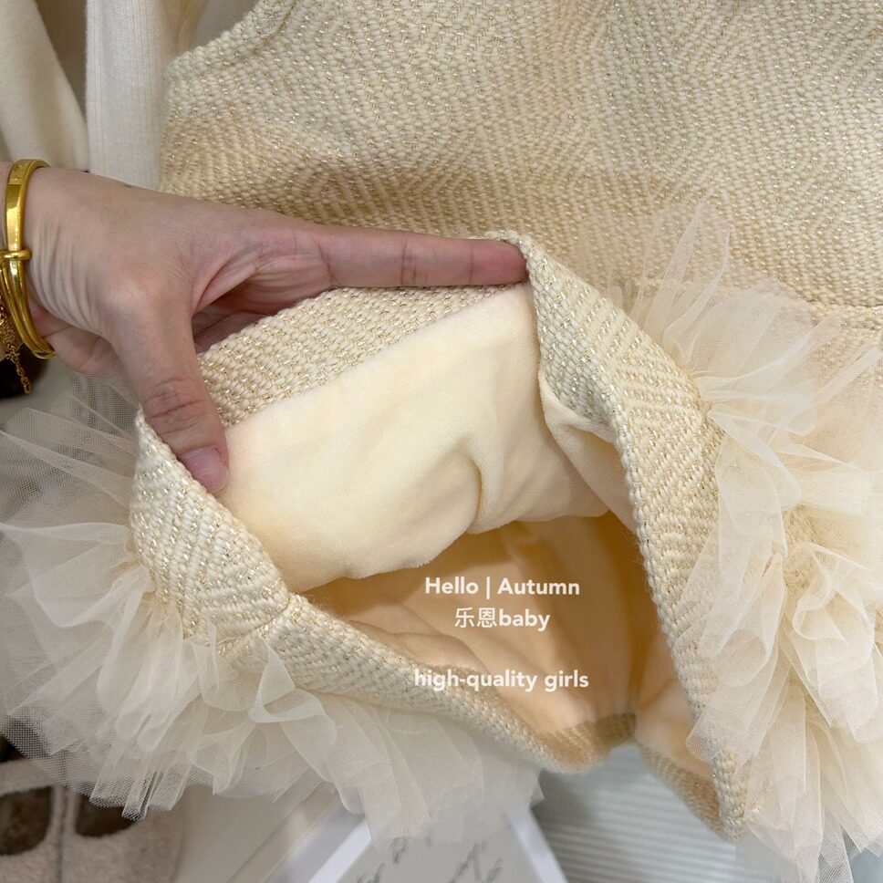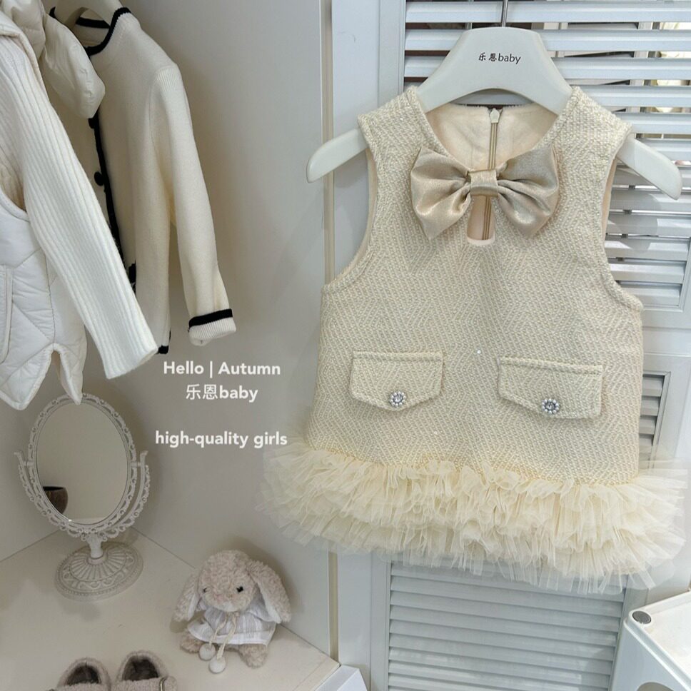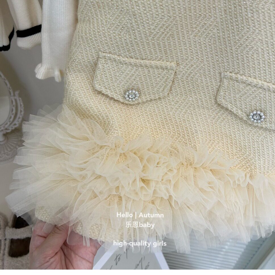【乐恩童装】女童秋冬新款奶黄色背心加绒裙米白色毛衣小香风套装