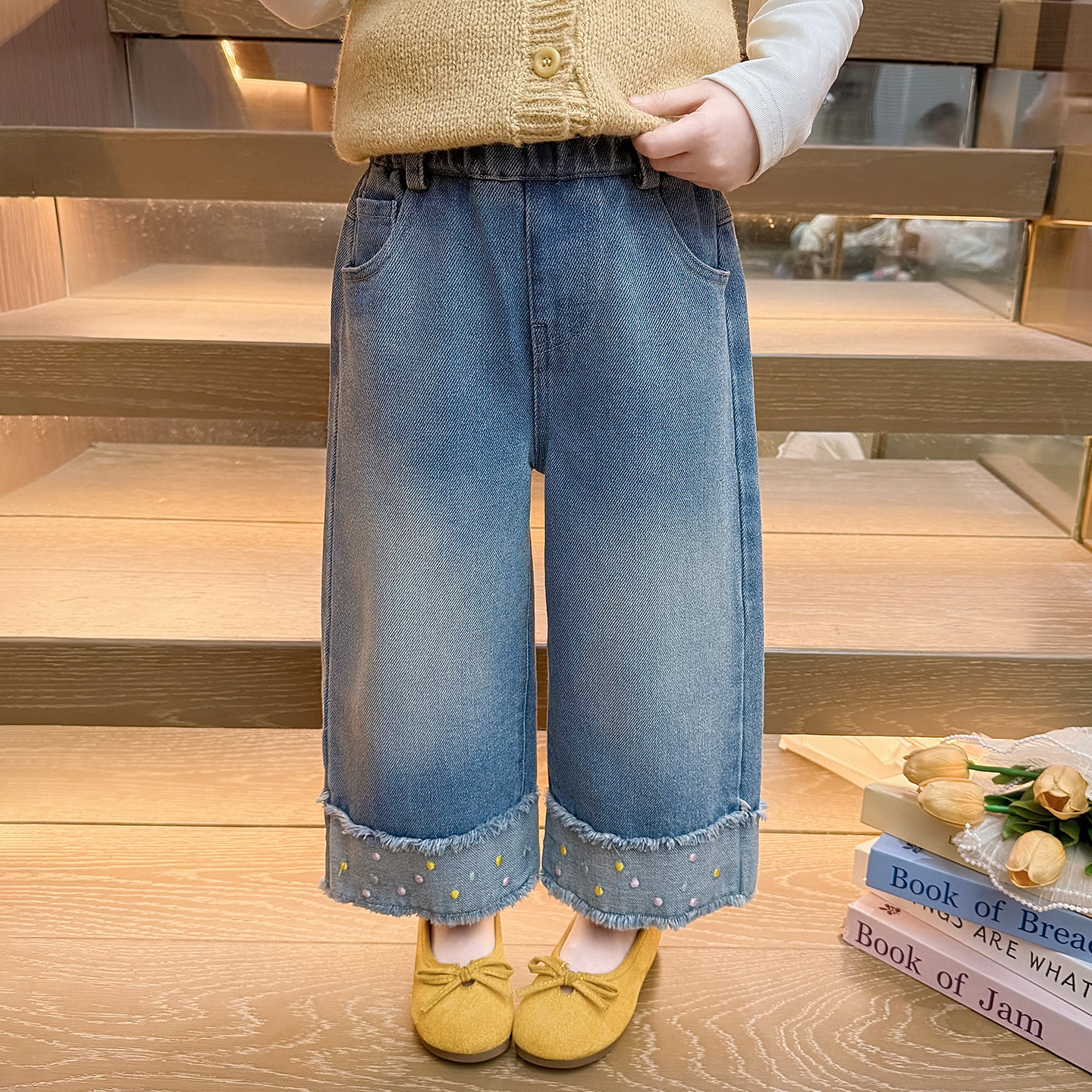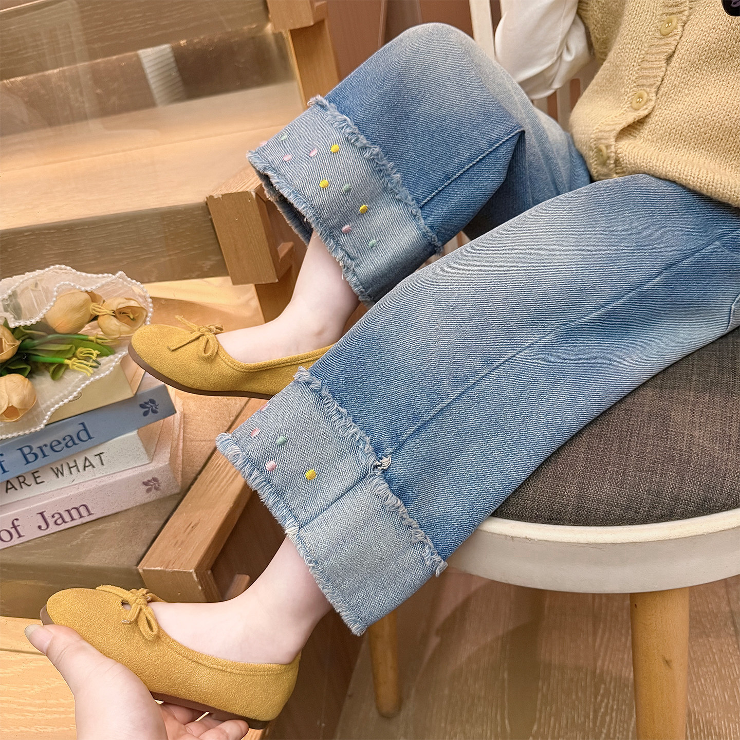 女童牛仔裤春秋款2026新款儿童春季女宝宝圆点春装直筒裤阔腿裤子