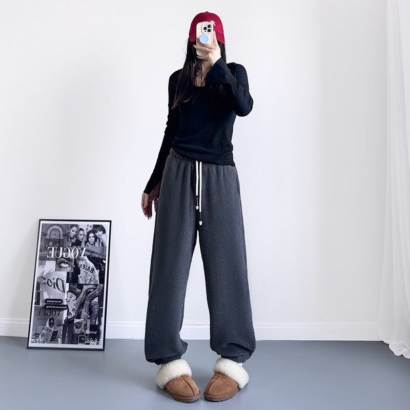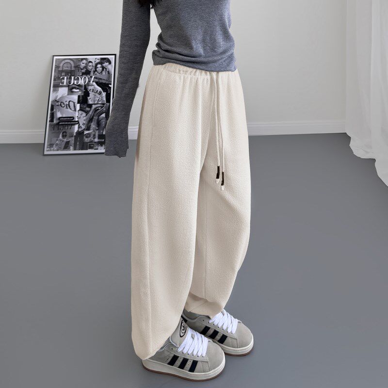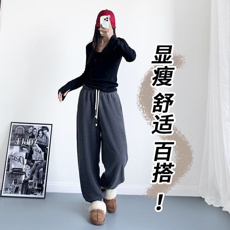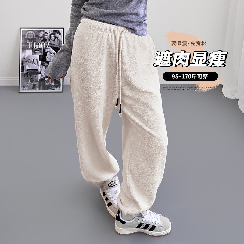 米白色卫裤女加绒加厚束脚宽松胖mm双面外穿奶fufu慵懒摇粒绒裤子