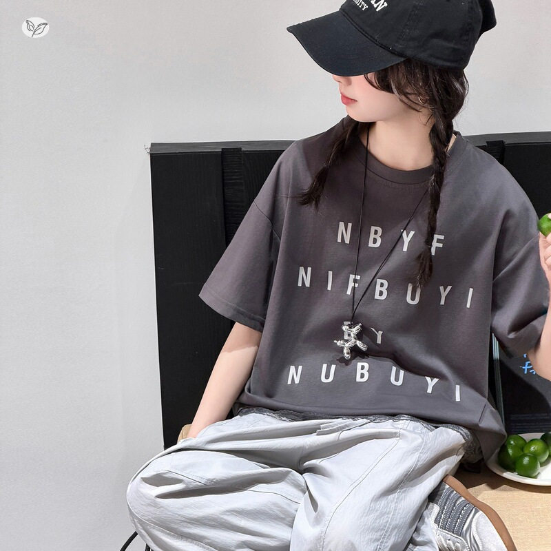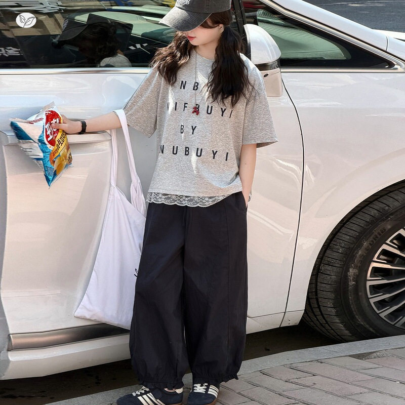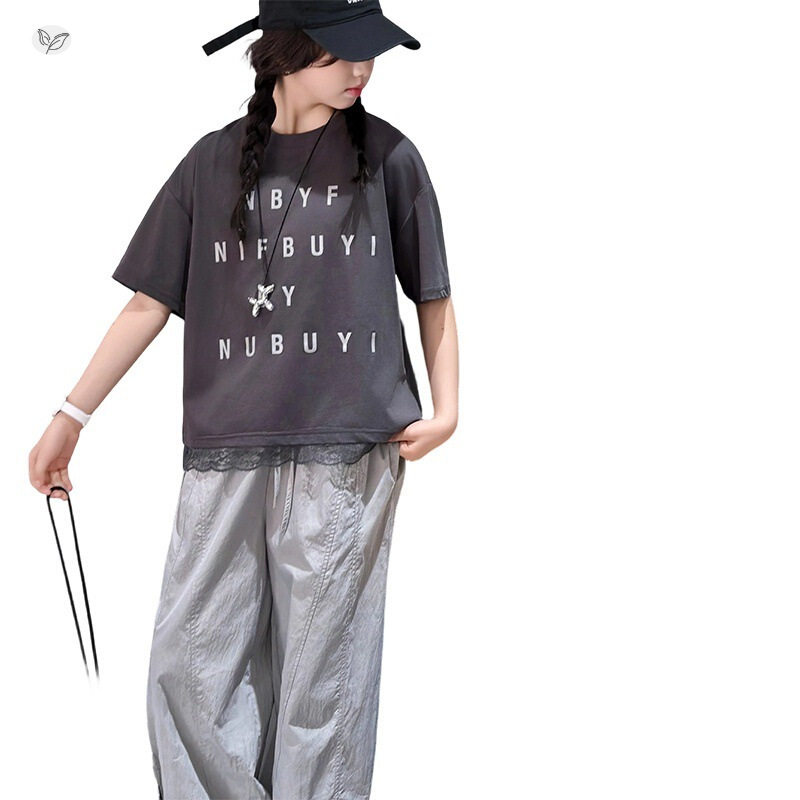 女童字母印花T恤休闲裤套装2026夏季新款中大童蕾丝下摆短袖上衣