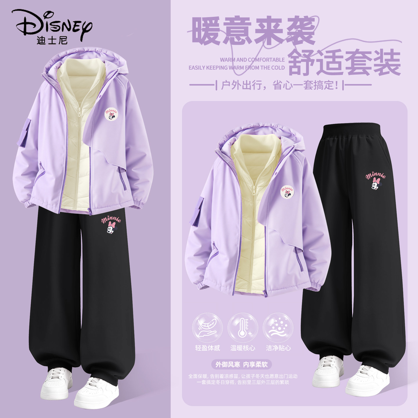 迪士尼女童冬季套装2026新款学生紫色保暖羽绒内胆儿童冬装运动装