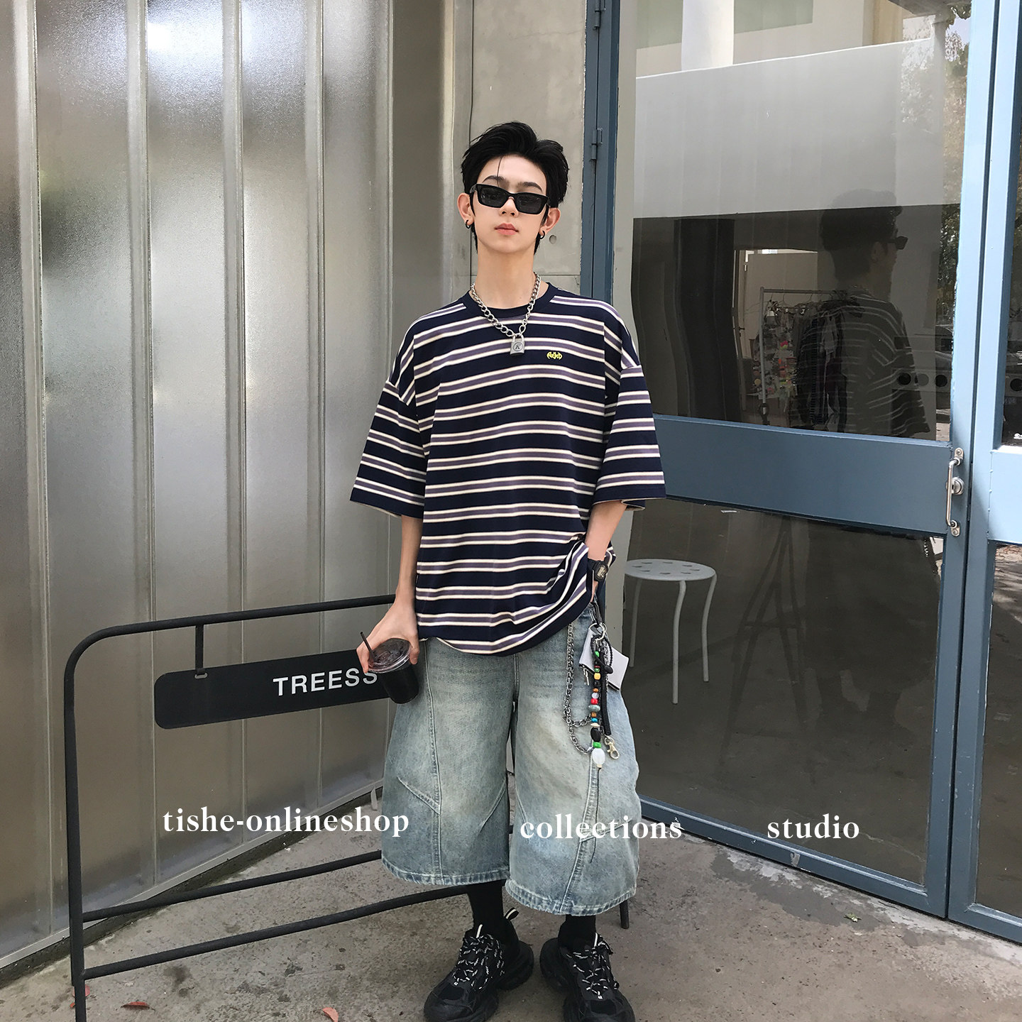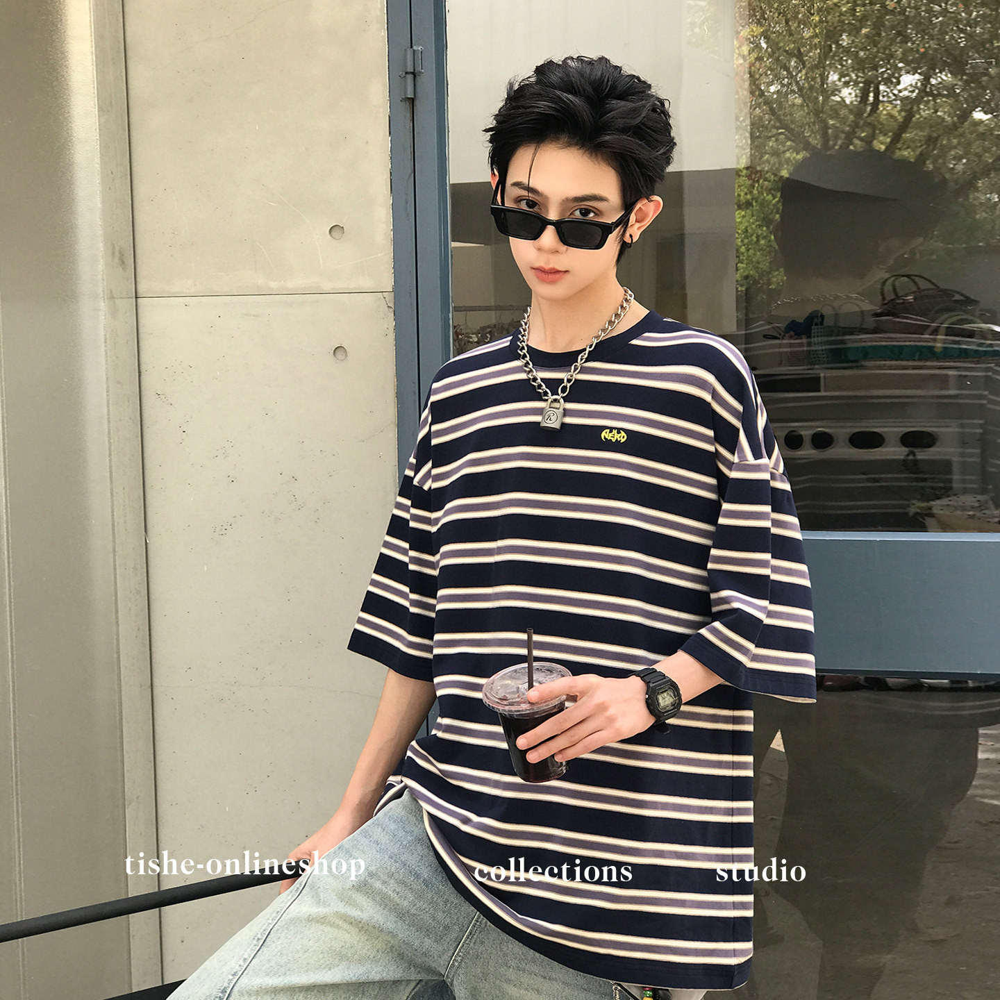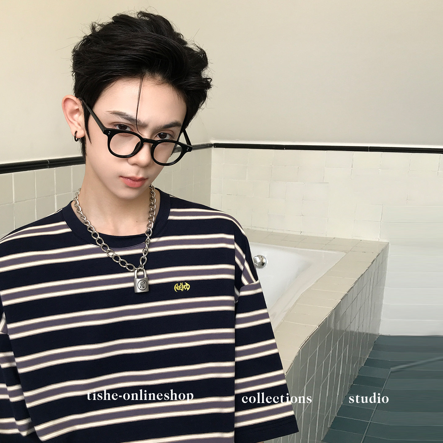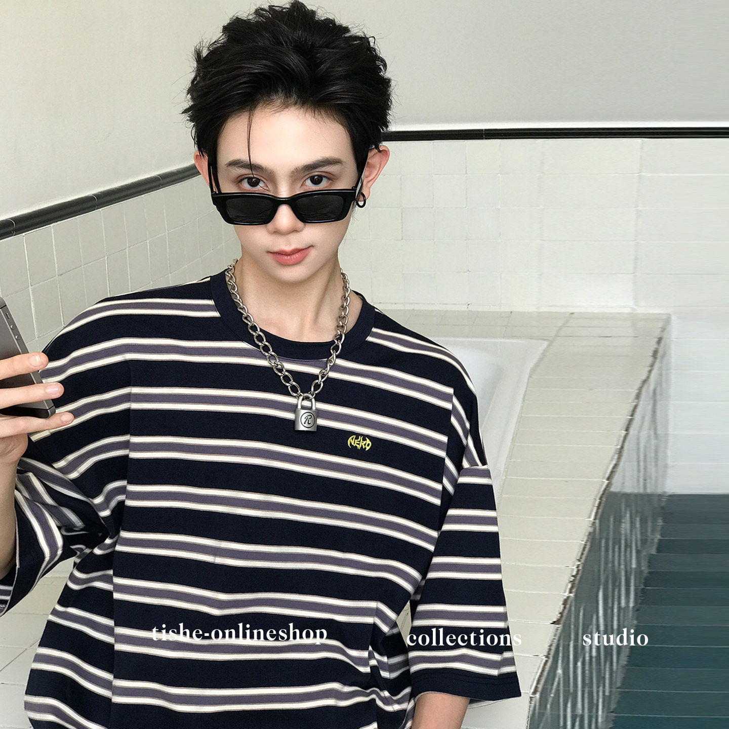 男大童短袖t恤纯棉2026夏季新款薄款青少年男孩夏装条纹T恤上衣潮