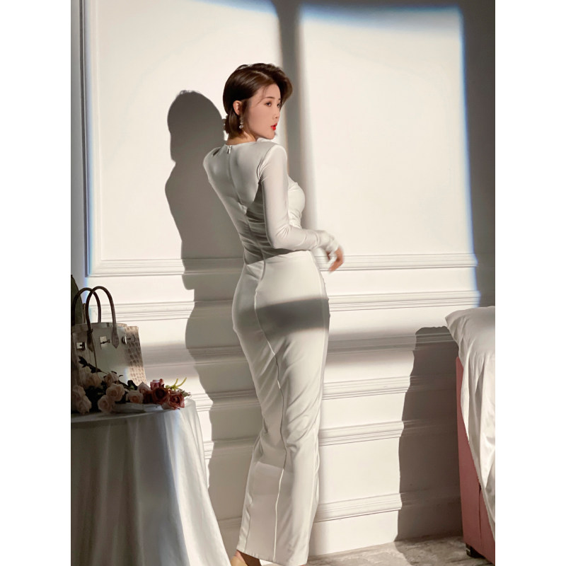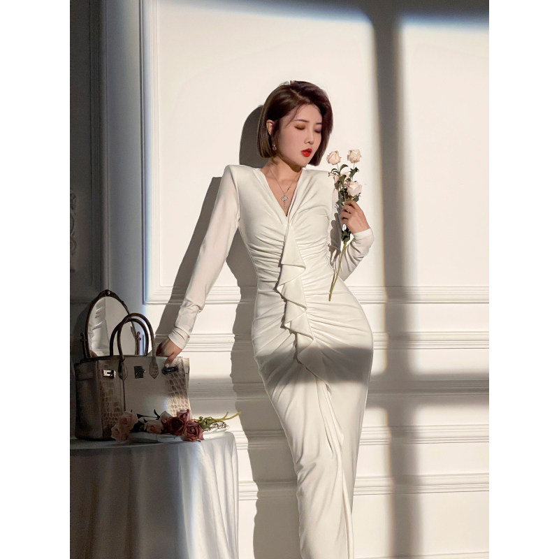 XULU原创轻奢简约纯色褶皱弹力荷叶边收腰显瘦长袖V领连衣裙