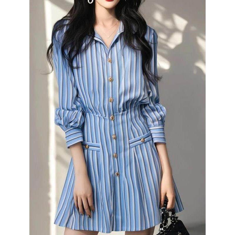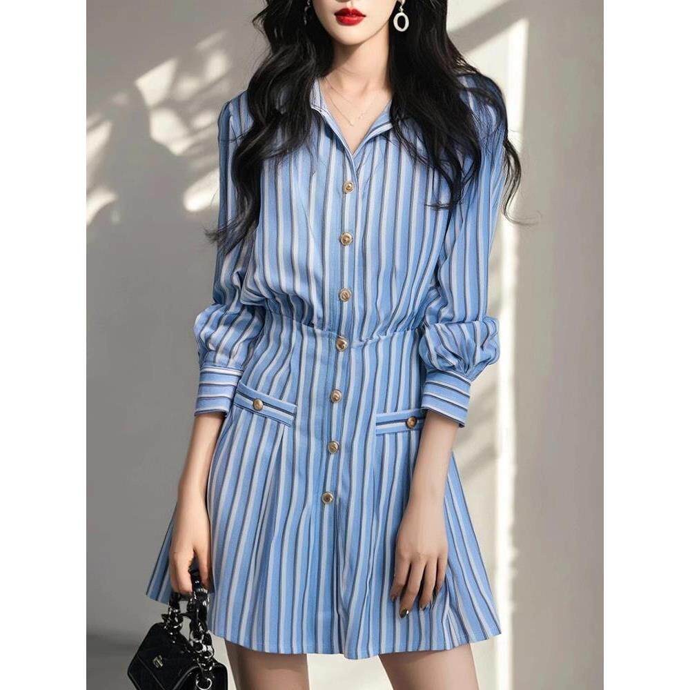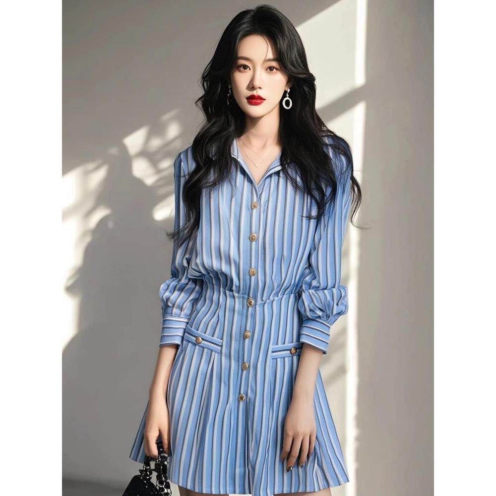 MONLOUVE品牌高级感经典翻领收腰条纹百褶长袖短款连衣裙女秋
