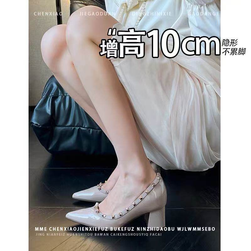 小个子内增高10CM高跟鞋女2025秋新款裸灰色铆钉粗跟尖头浅口单鞋