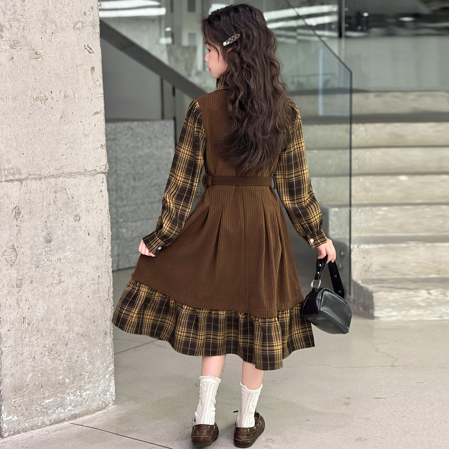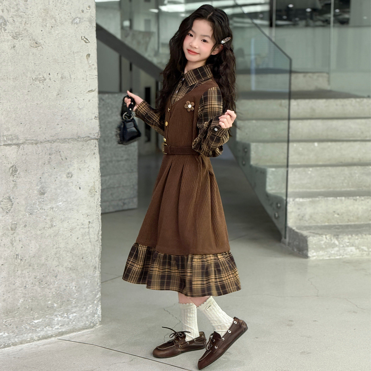 女童春装连衣裙2026新款初中生时髦假两件条绒裙子气质大童格子裙