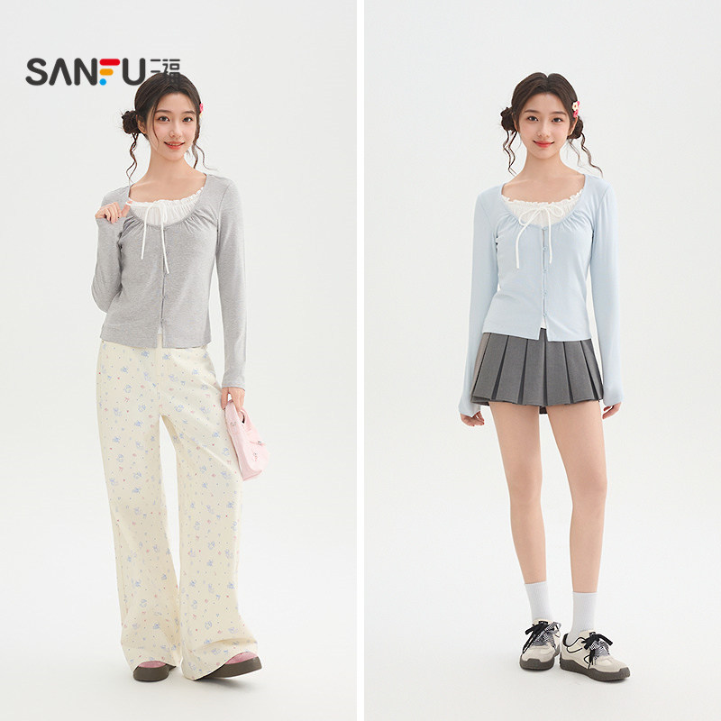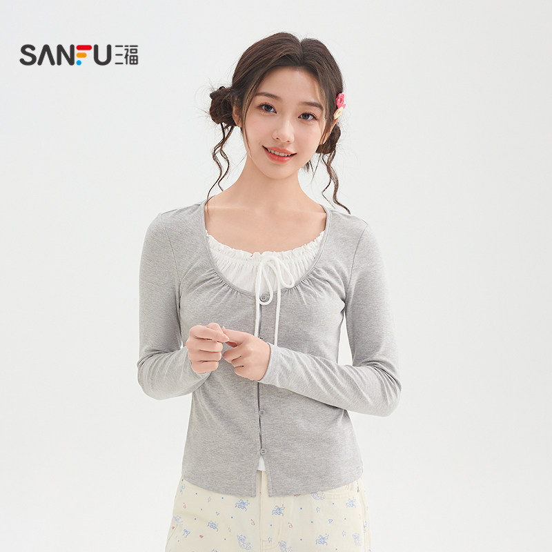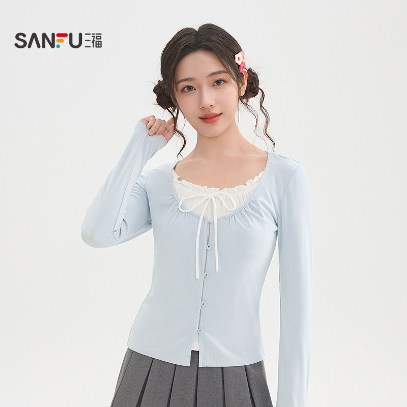 三福长袖T恤女2026新款春季小个子绑带假两件短款上衣女装517366