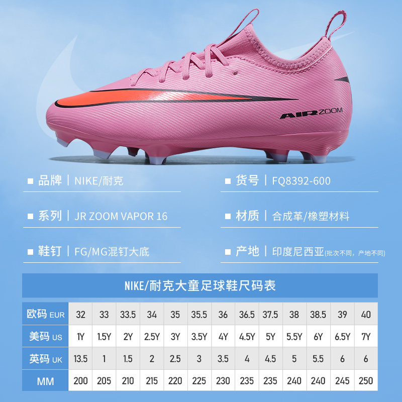NIKE刺客16儿童足球鞋 耐克VAPOR缓震FGMG短钉人草男童女孩小学生