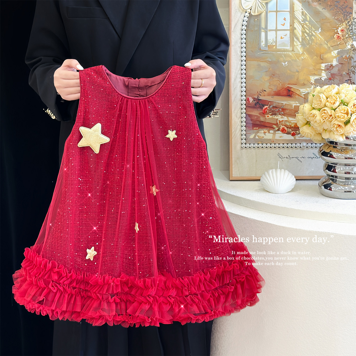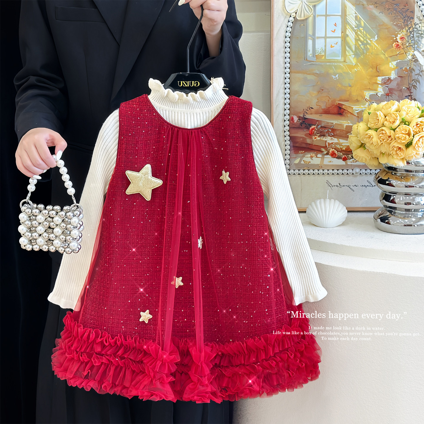 女童红色连衣裙秋冬季洋气蓬蓬纱裙高级感星星公主裙儿童加绒裙子