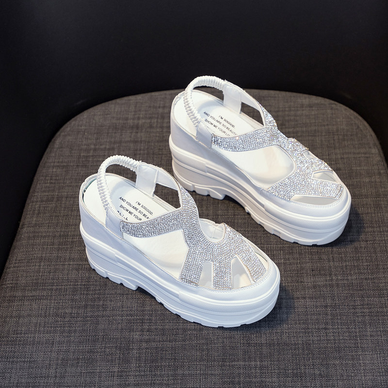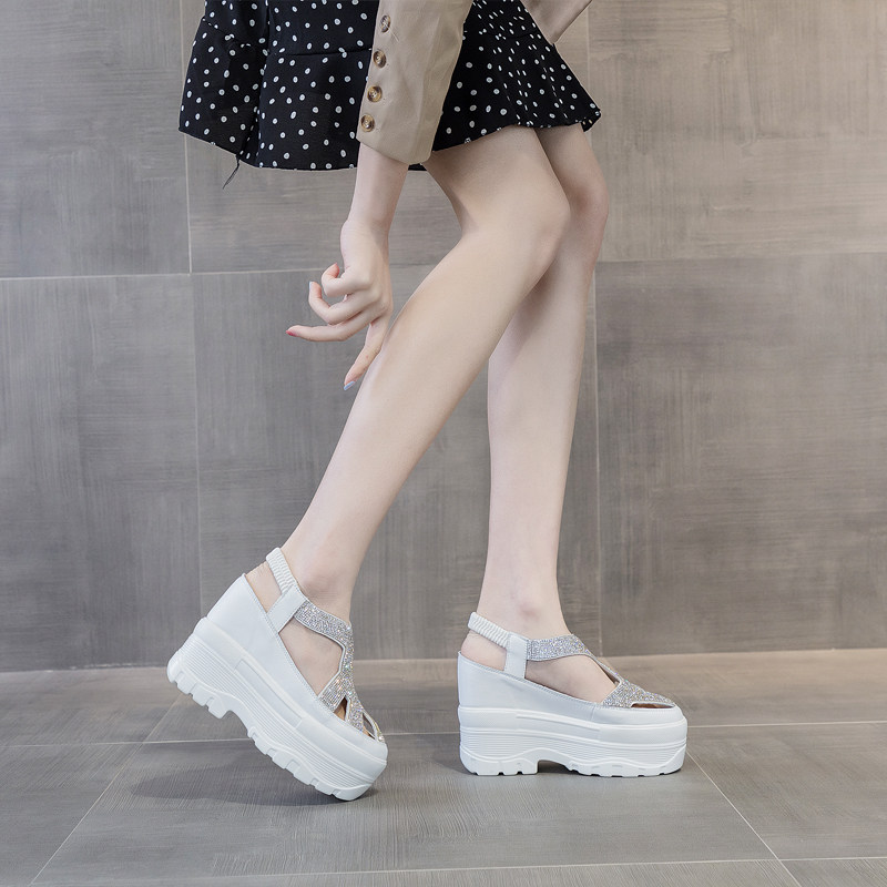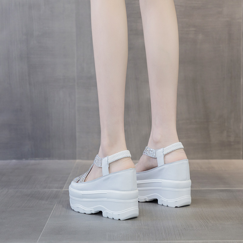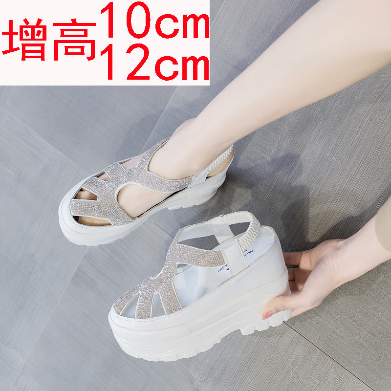 小白鞋女内增高跟12公分镂空透气夏季10厘米小个子厚底松糕鞋水钻