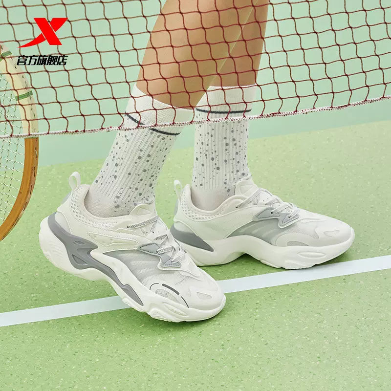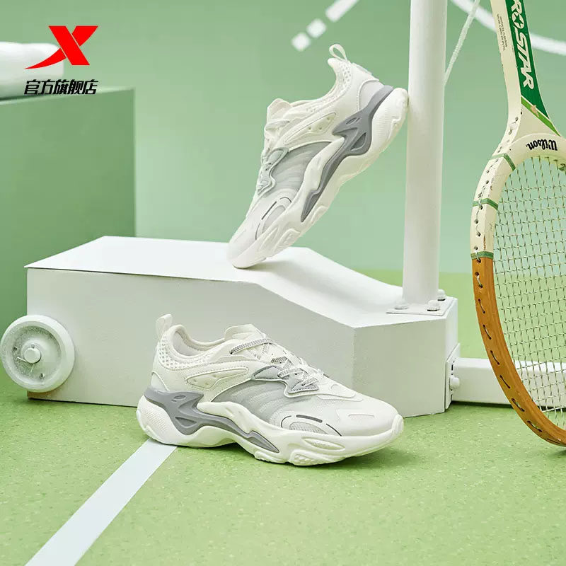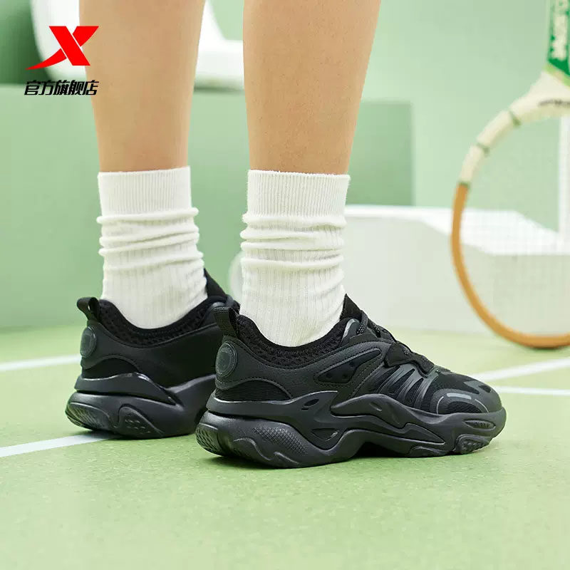 特步休闲鞋女鞋单层网面春季透气老爹鞋轻便运动鞋复古鞋潮流黑色