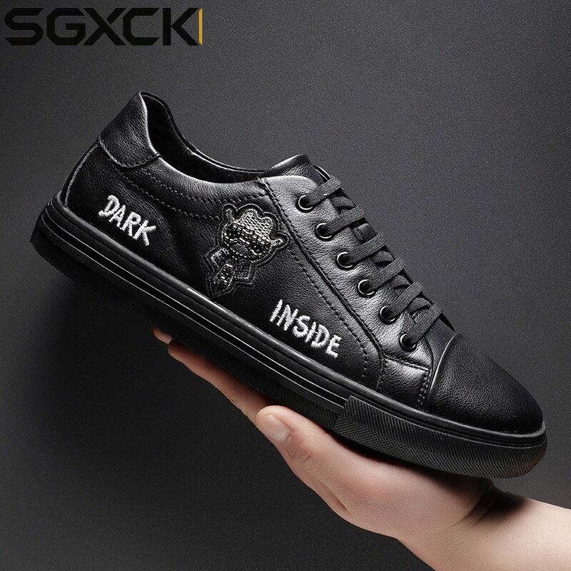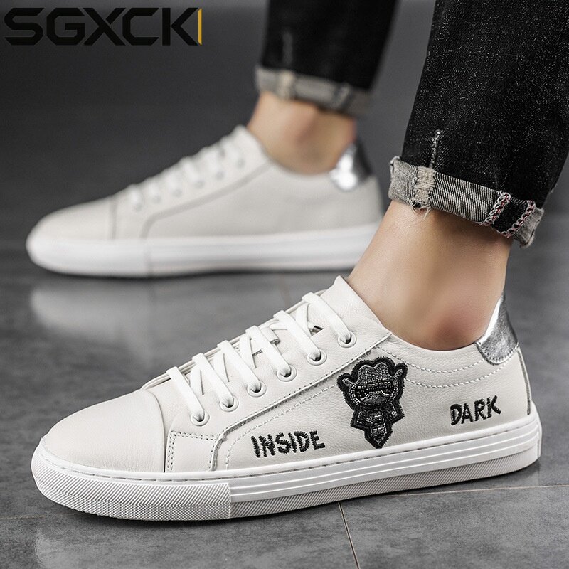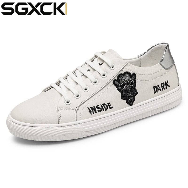 SGXCK 男鞋春季小白鞋刺绣真皮缝制板鞋英伦潮流休闲鞋子头层牛皮