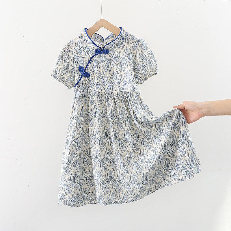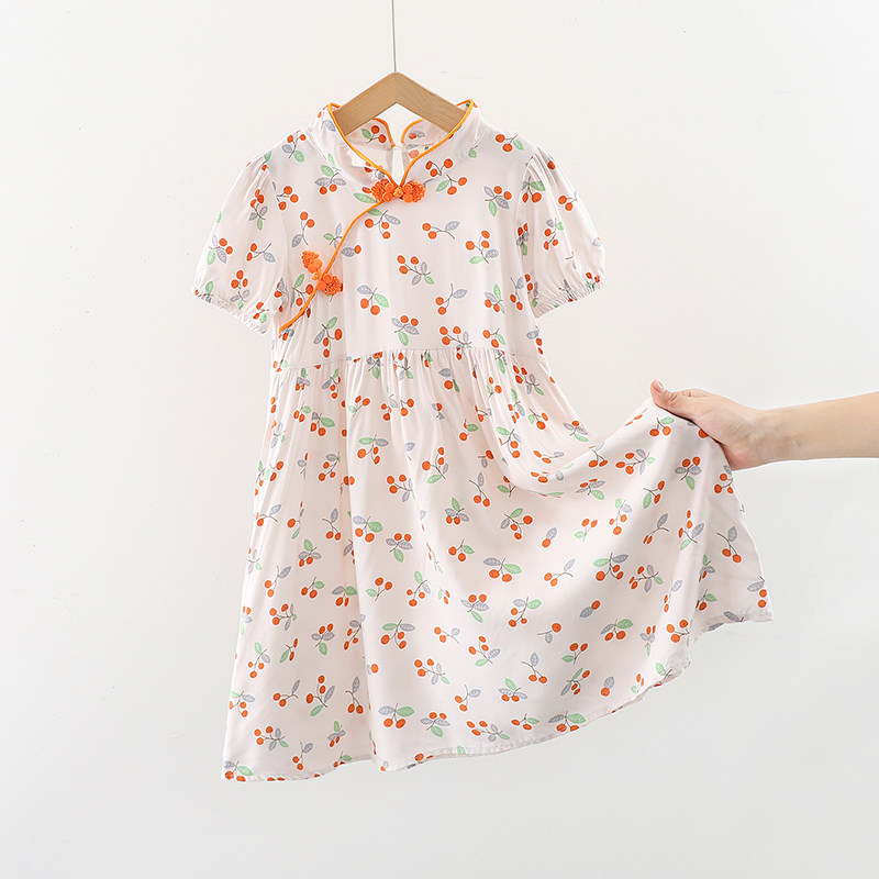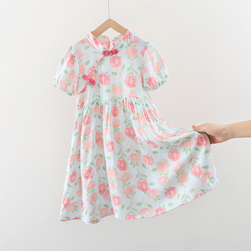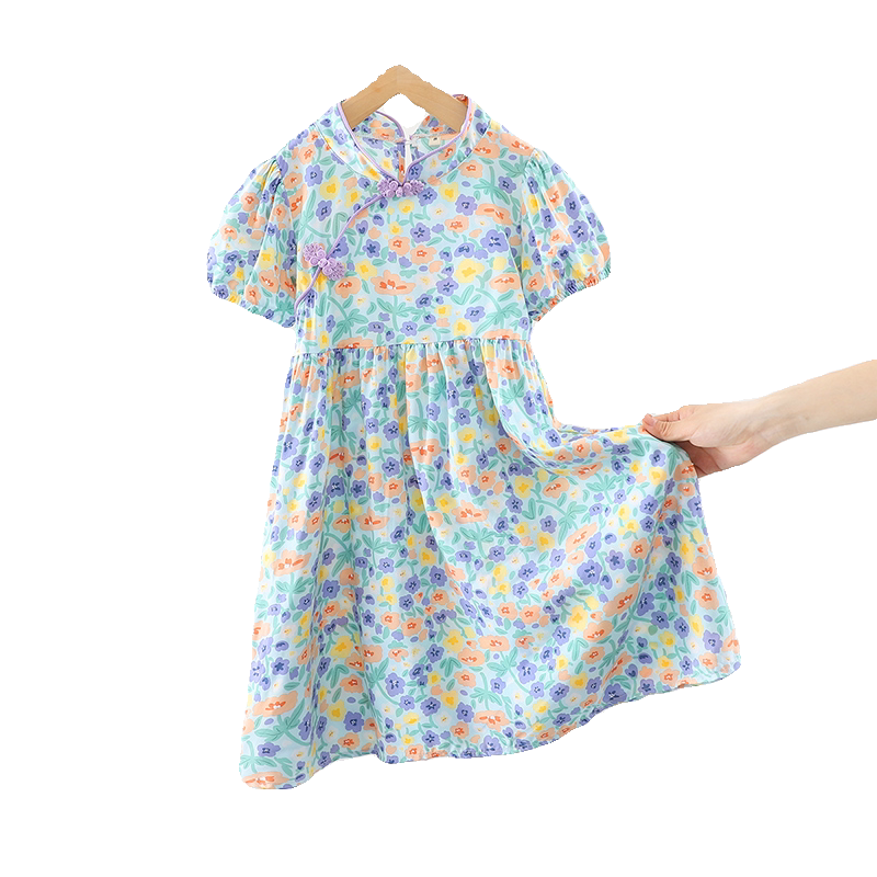 女童裙子中大童棉绸中国风碎花短袖裙小女孩夏季薄款人造棉连衣裙