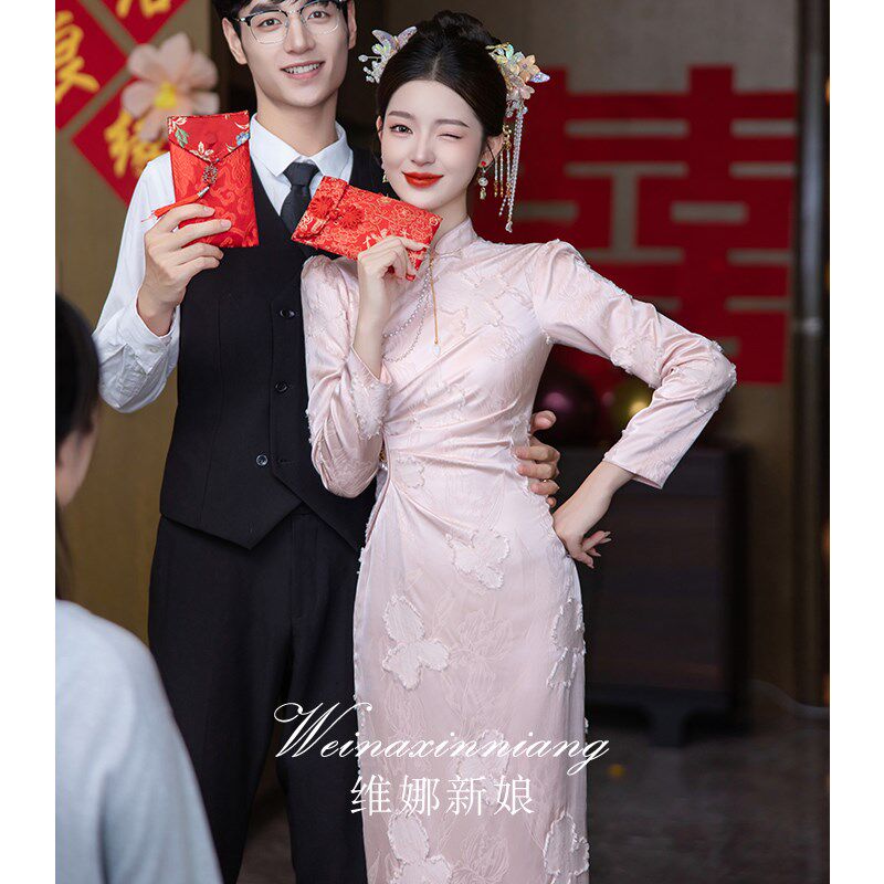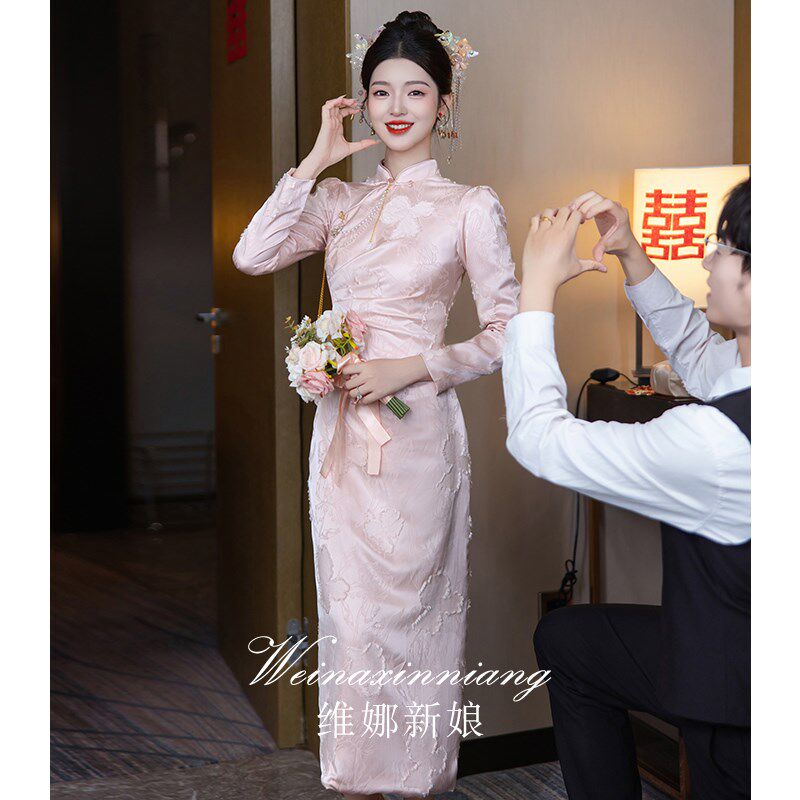 2024新款敬酒服新娘新中式旗袍粉色订婚晚礼服连衣裙长袖平时可穿
