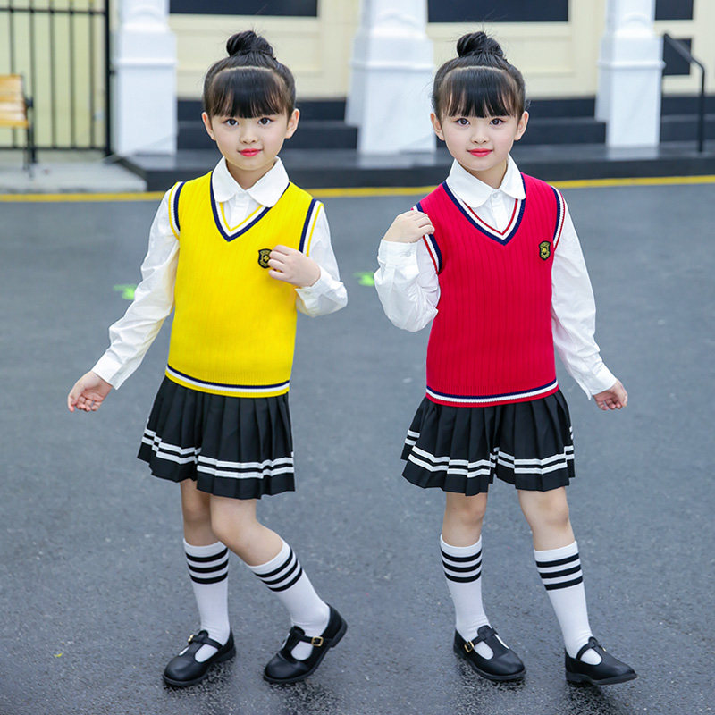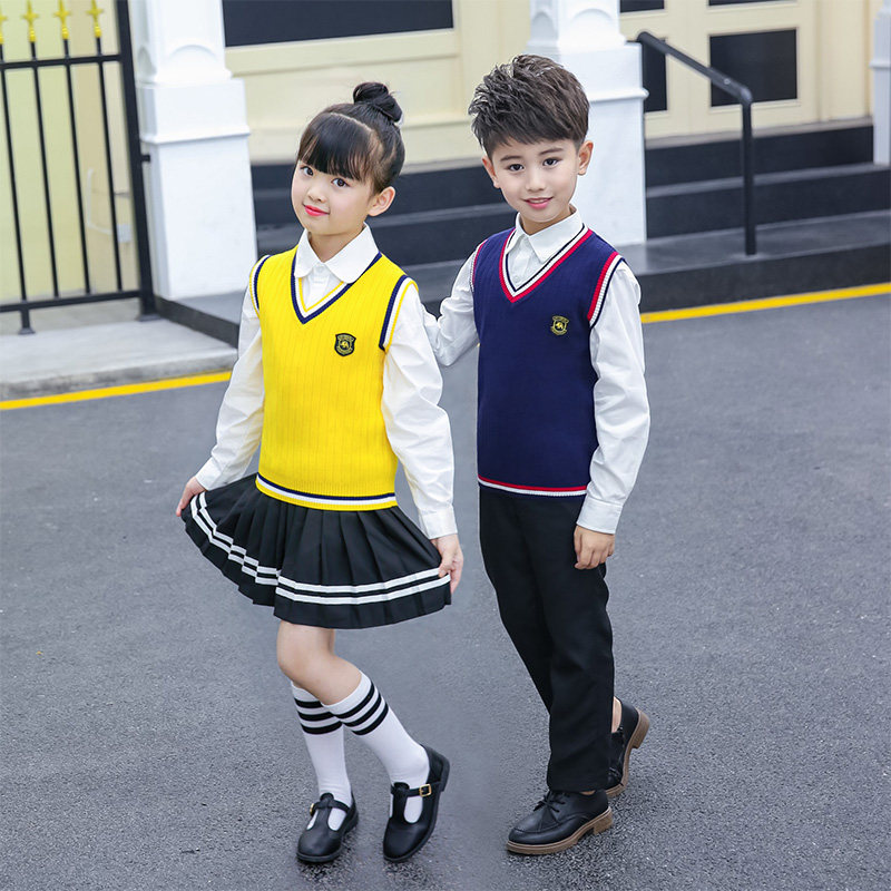 儿童毛线马甲女孩毛衣小学生坎肩女童针织背心校服秋冬黄色学院风