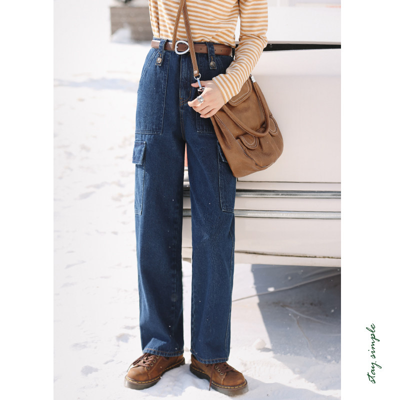 花吉K298蓝色高腰工装大口袋宽松直筒牛仔裤女2026新款冬季阔腿裤