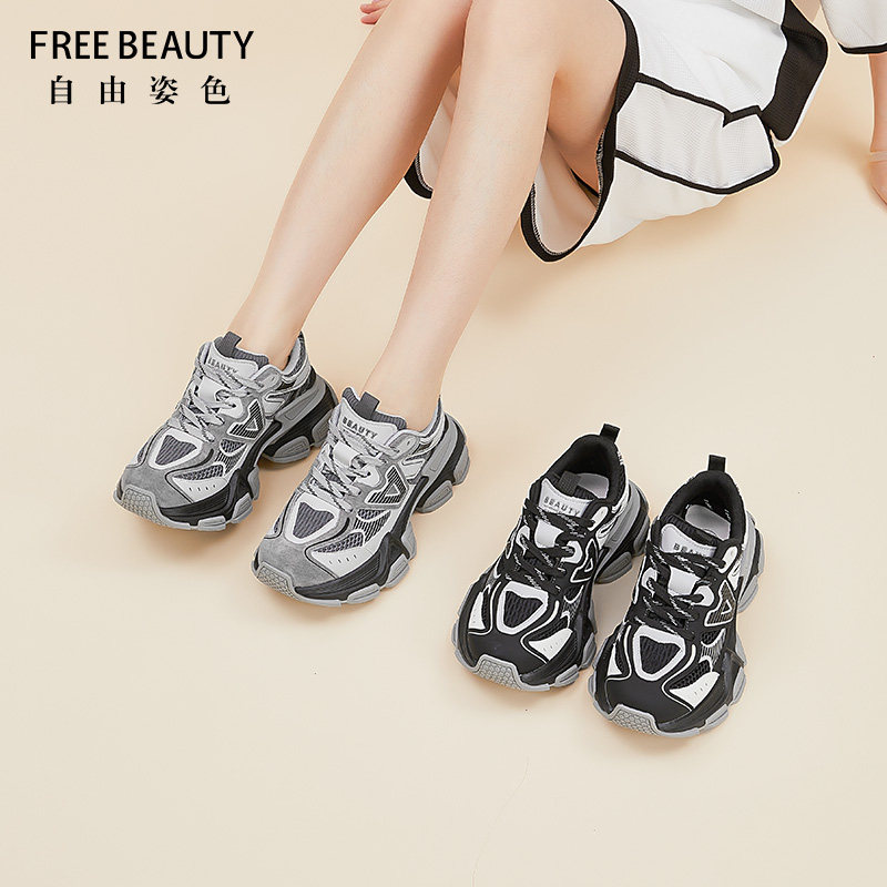 自由姿色春秋新款网纱拼接厚底老爹鞋女增高撞色炸街个性休闲鞋女