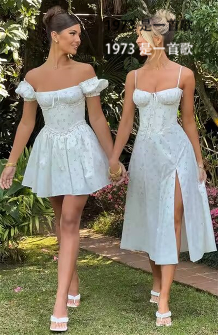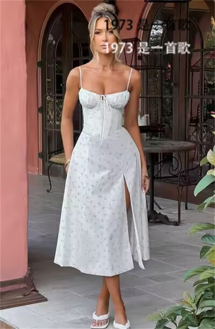 法式复古白色雪纺修身长款吊带连衣裙夏季过膝碎花收腰开叉A字裙