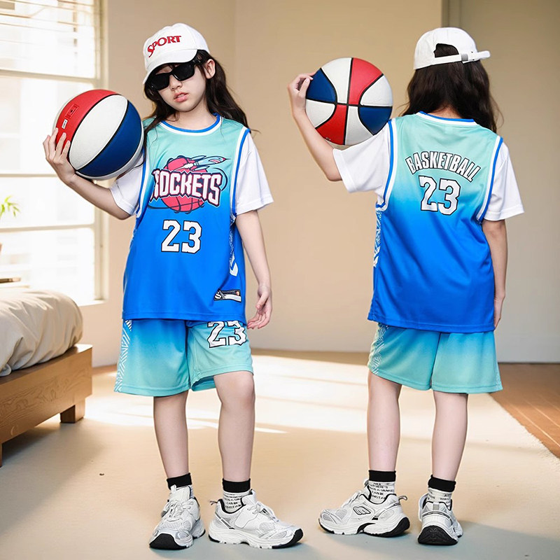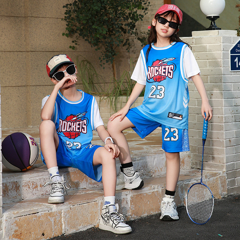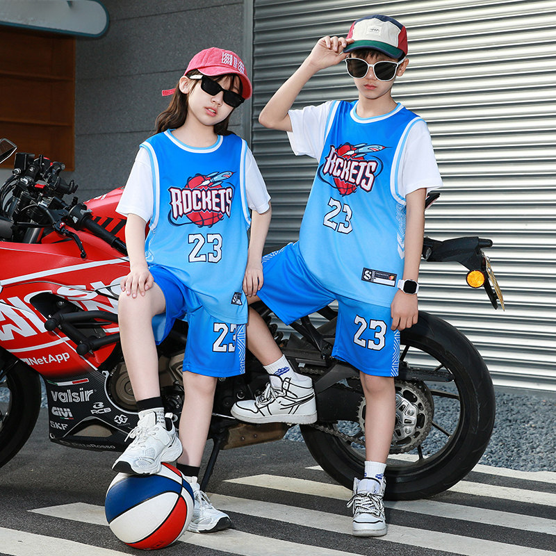 儿童专业篮球服套装男女童假两件23号蓝色球衣中小童幼儿园表演服