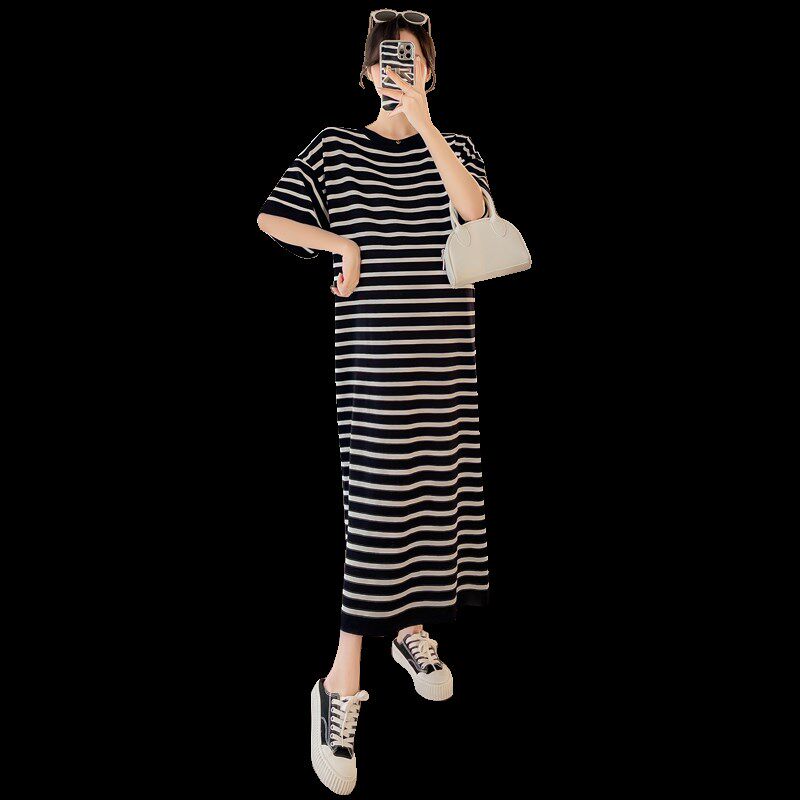 大码孕妇连衣裙夏季短袖T恤长裙时尚宽松气质显瘦条纹裙X过膝200