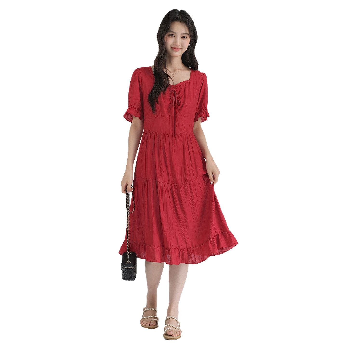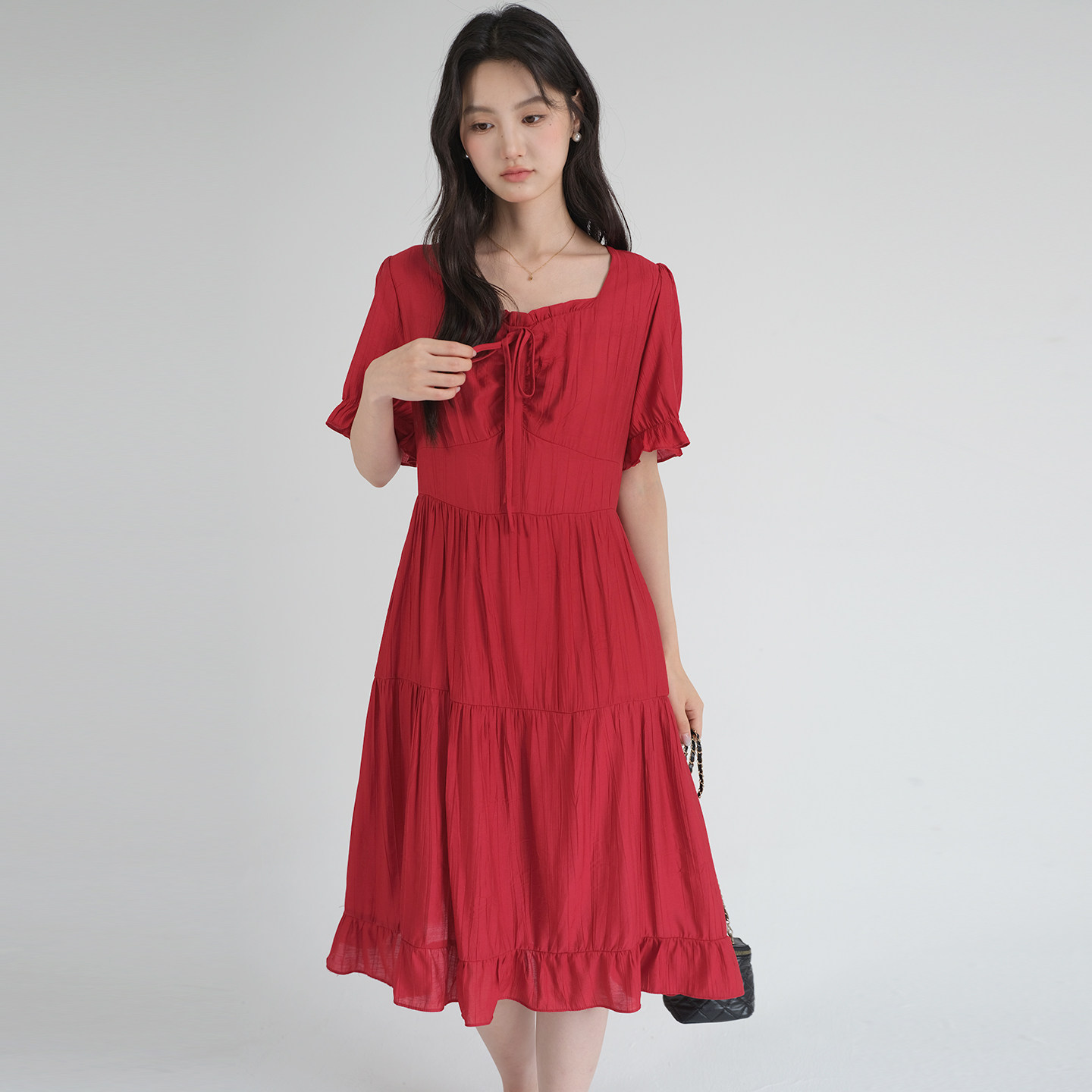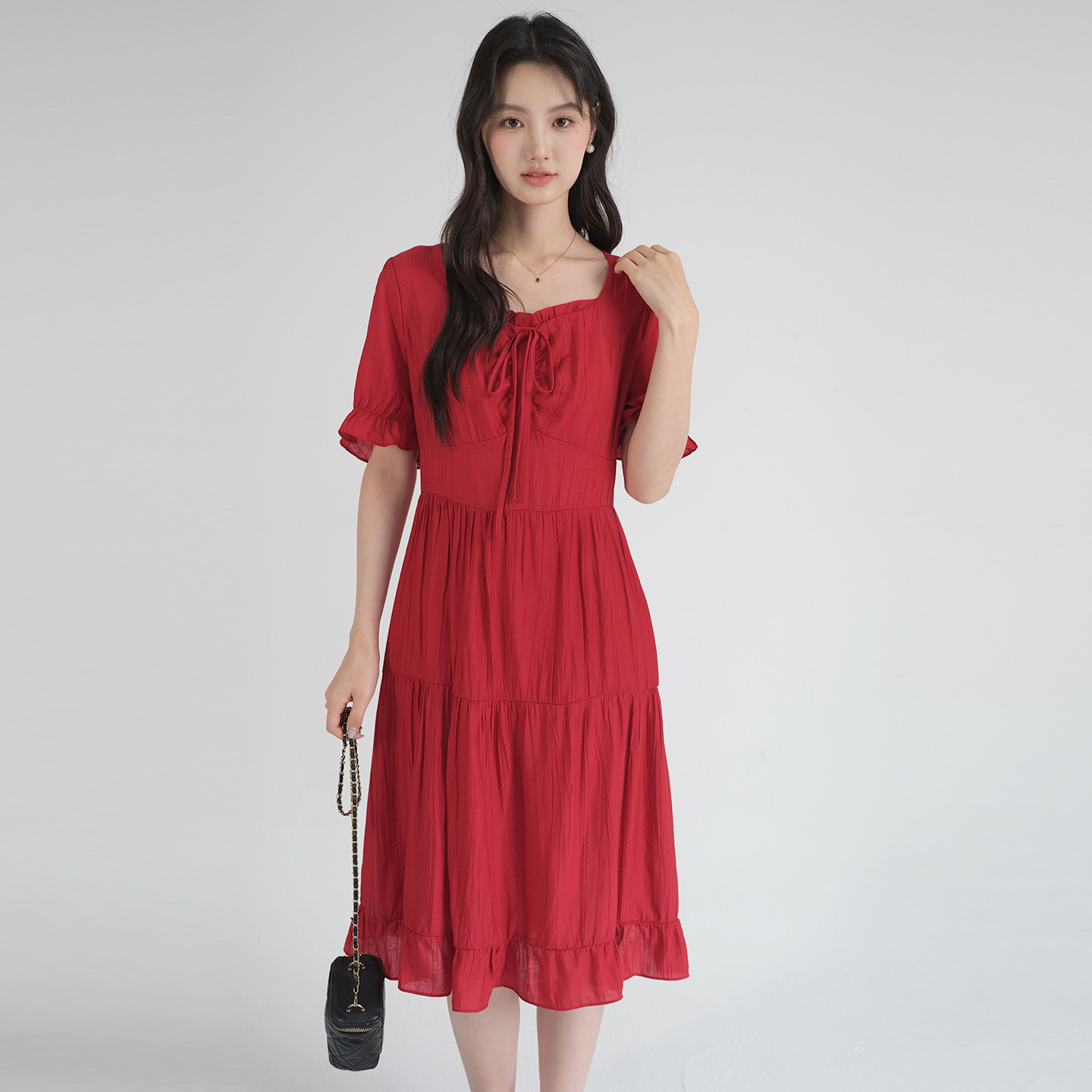 311线报网描述:复古红色方领连衣裙高腰显瘦茶歇法式连衣裙