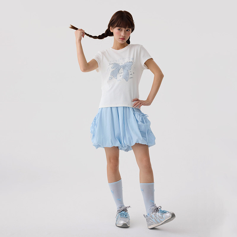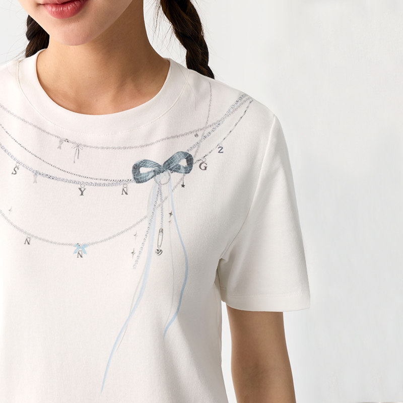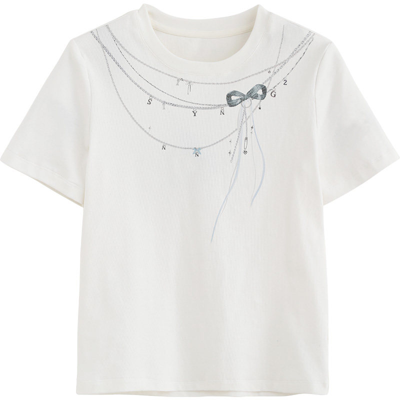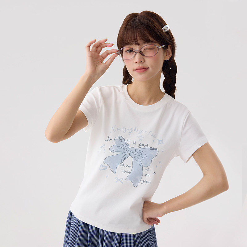 诺诺公主S1N初中生白色圆领短袖上衣女2026夏季蝴蝶结印花修身T恤