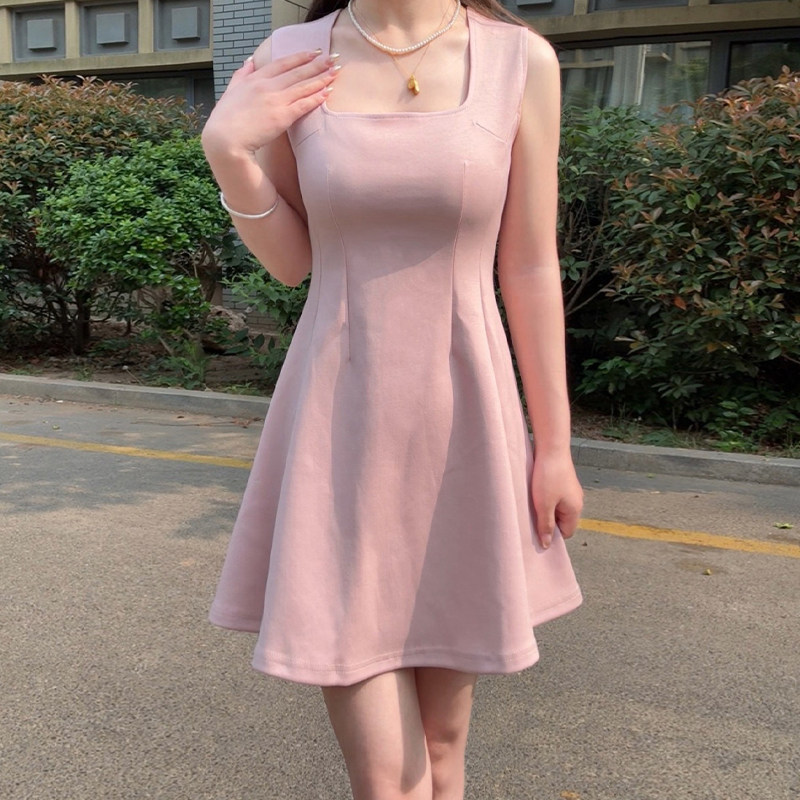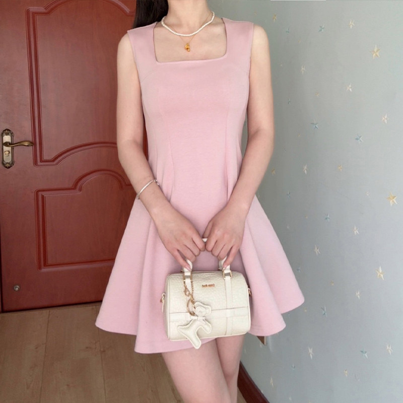 千金风粉色方领无袖连衣裙女夏收腰显瘦A字短裙2026巨好看连衣裙