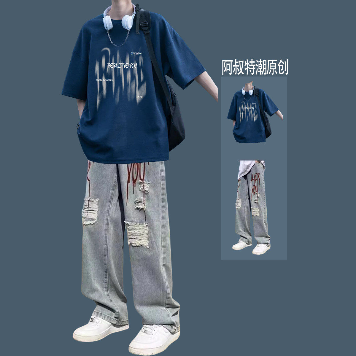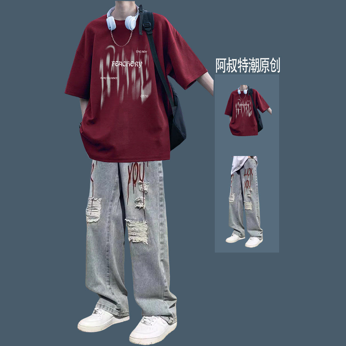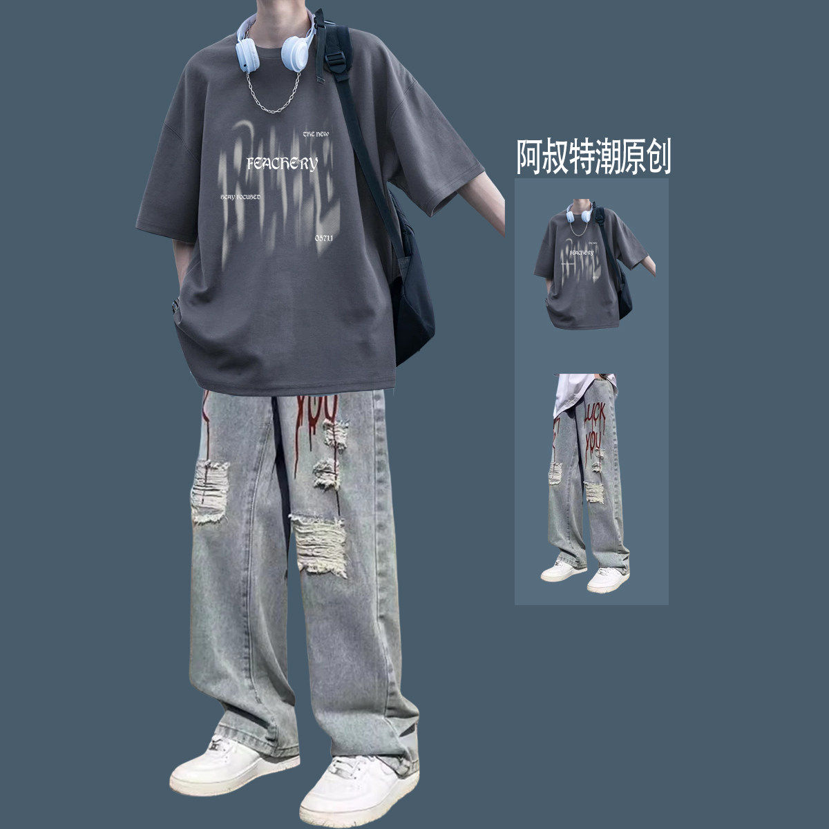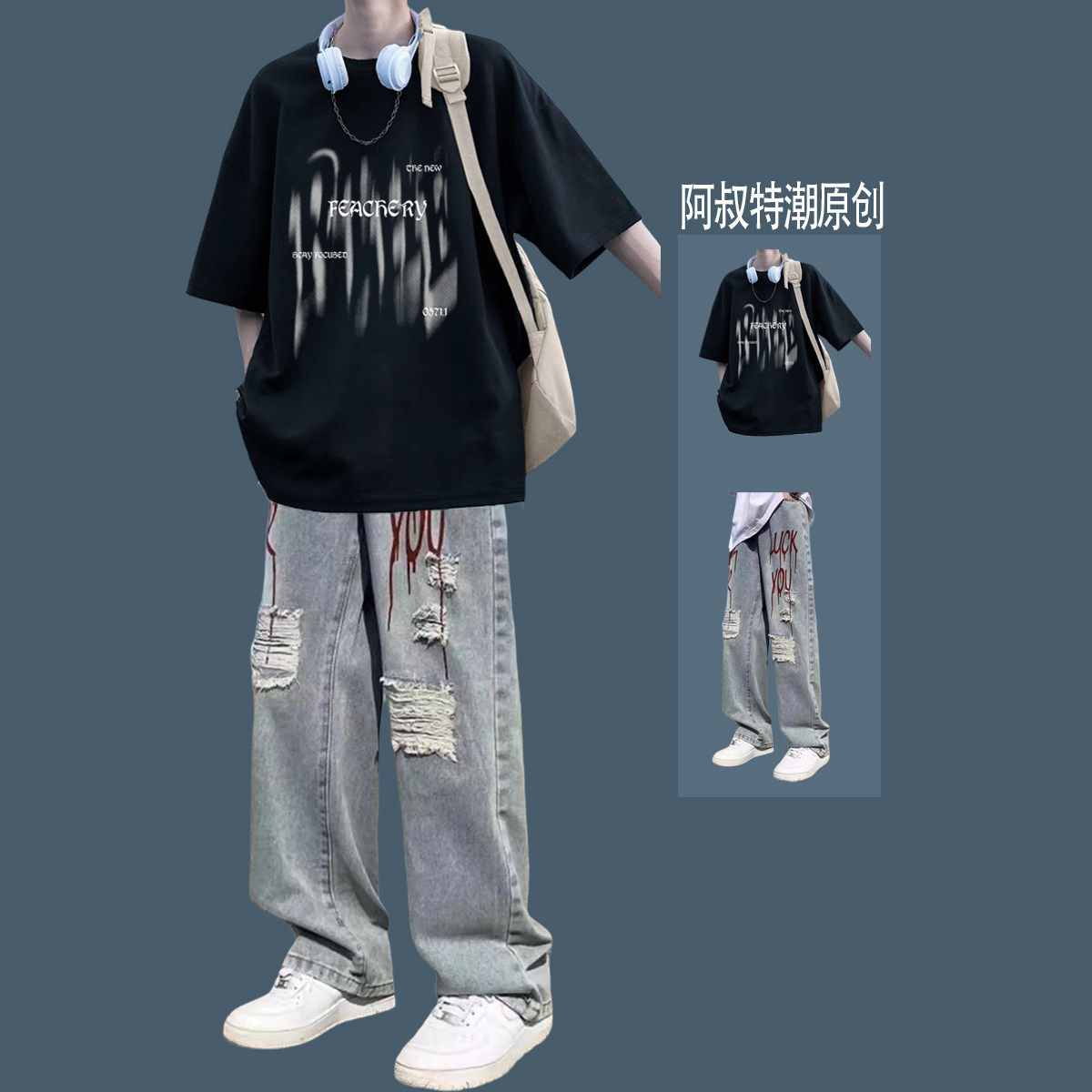 青少年美式纯棉短袖T恤男生穿搭夏季套装帅气一套搭配破洞牛仔裤