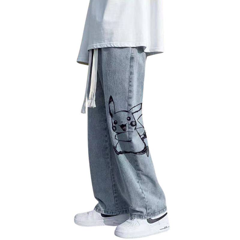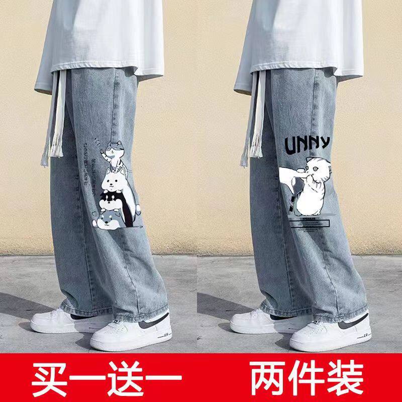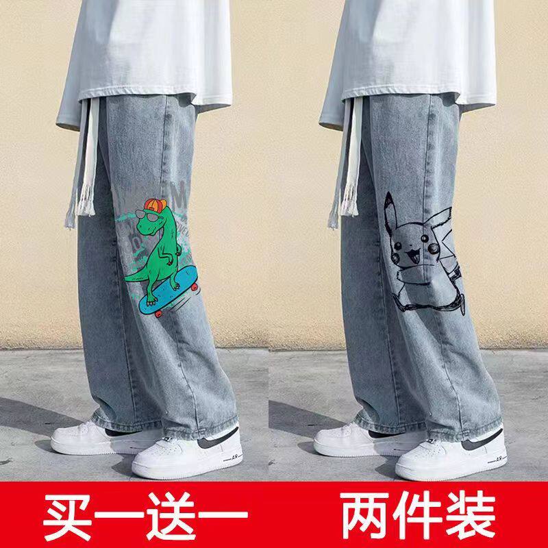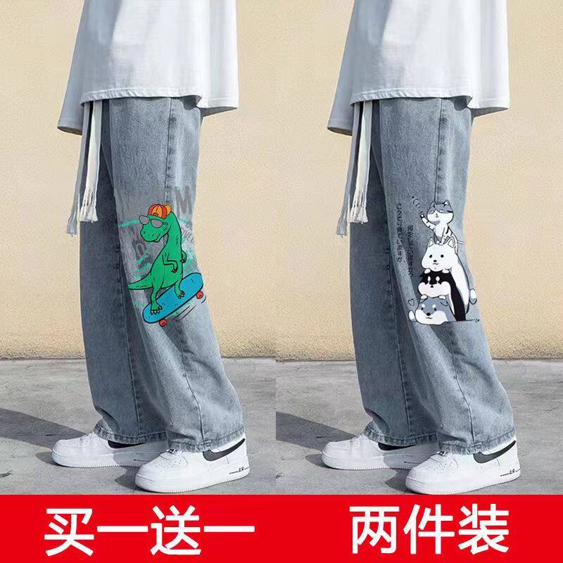 卡通印花牛仔裤男夏季薄款直筒宽松长裤男款浅色潮牌高街阔腿裤子