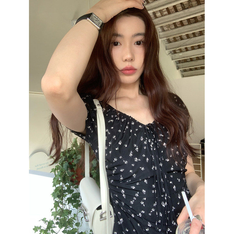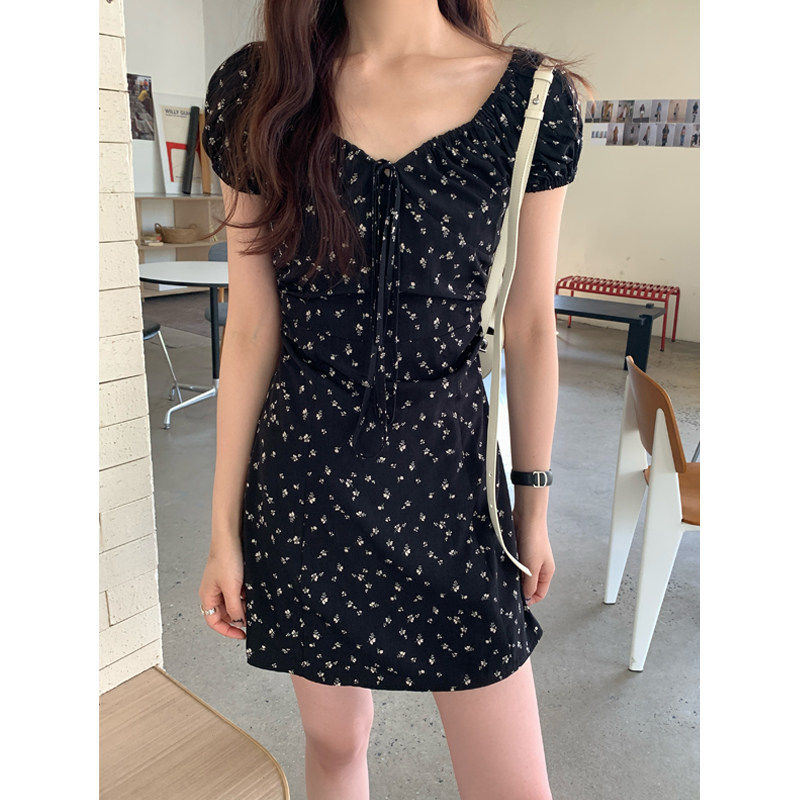 Halo Luu 茶歇法式黑色碎花连衣裙女夏季韩系绝美收腰短款a字裙子