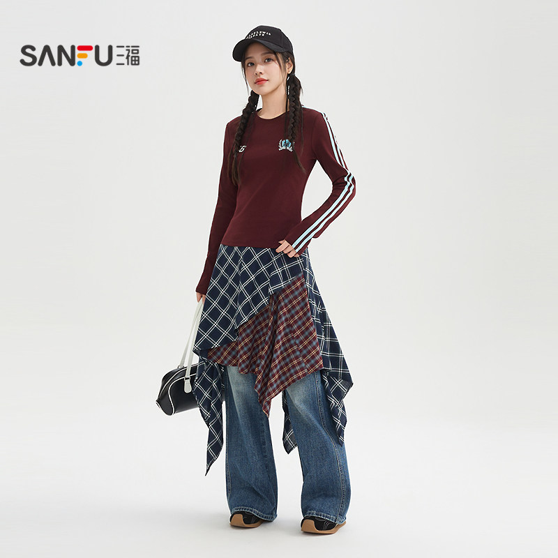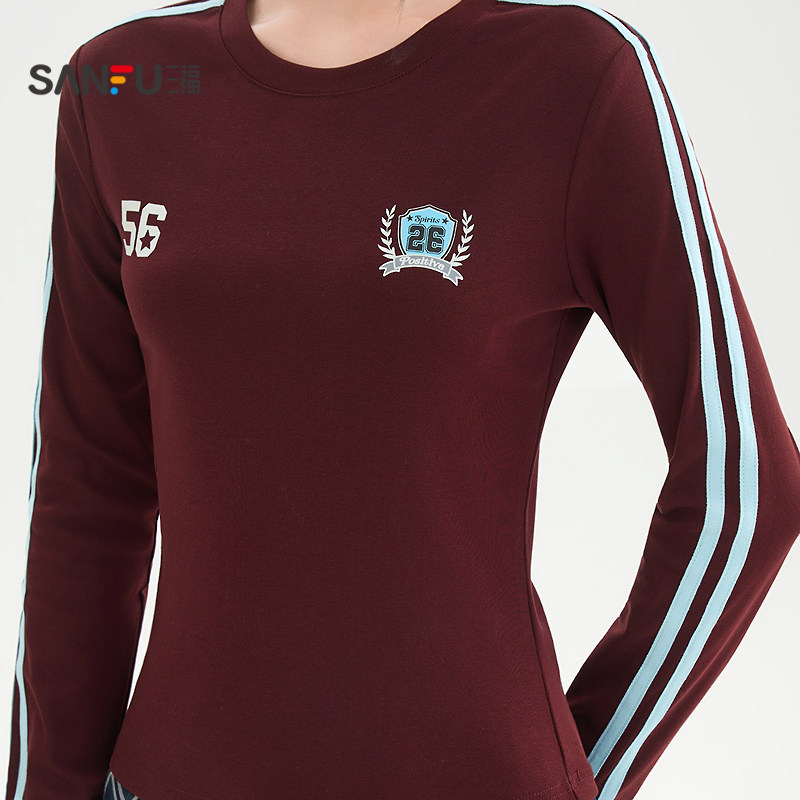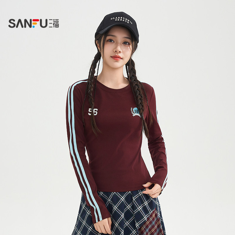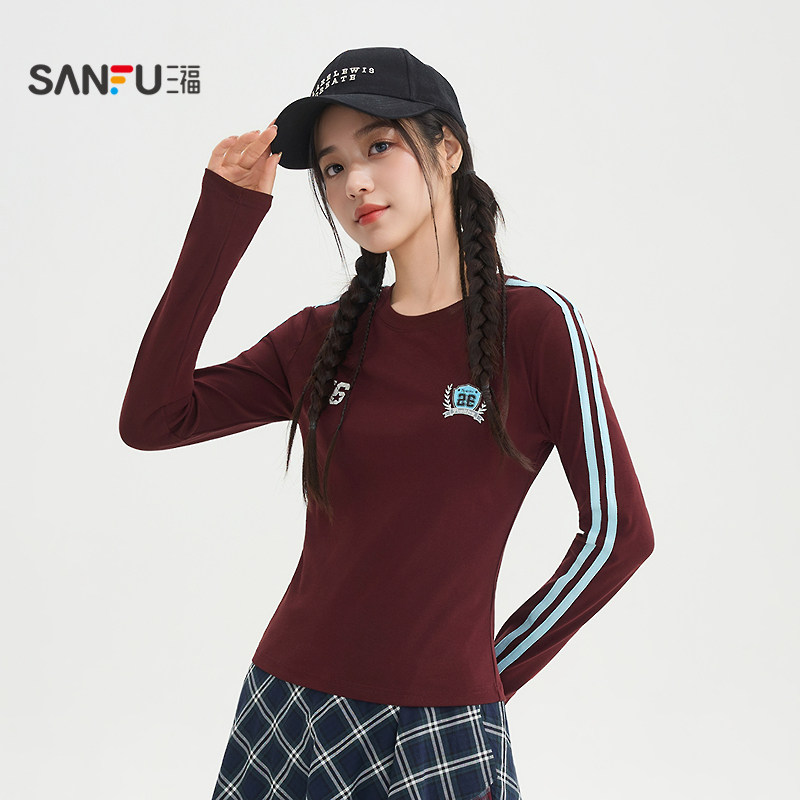 三福长袖上衣女2026新款春季美式运动风撞色袖短款t恤女装517645