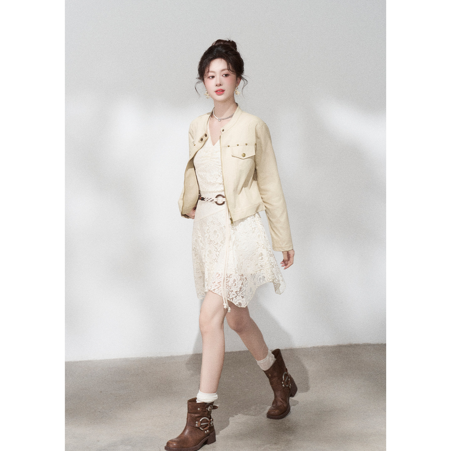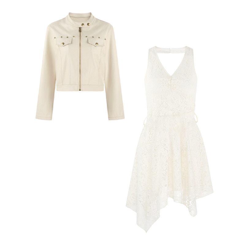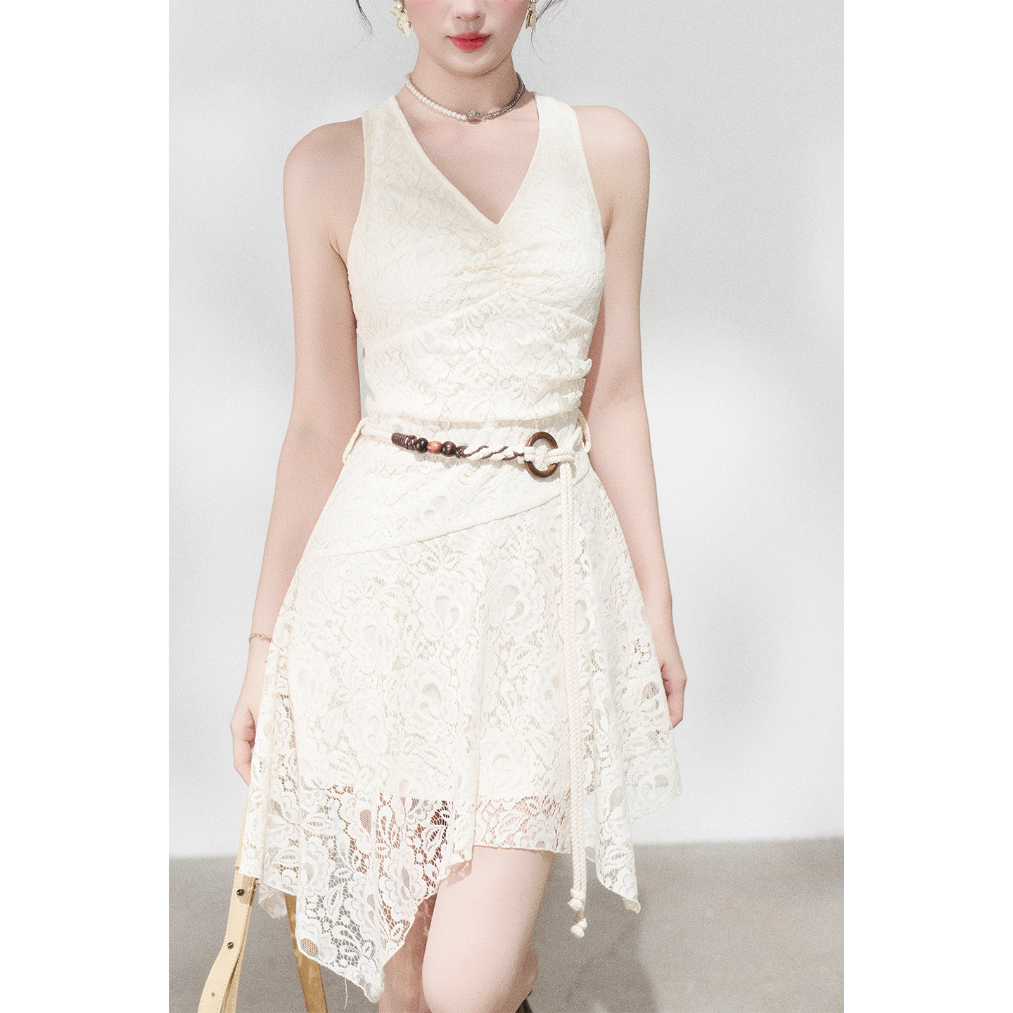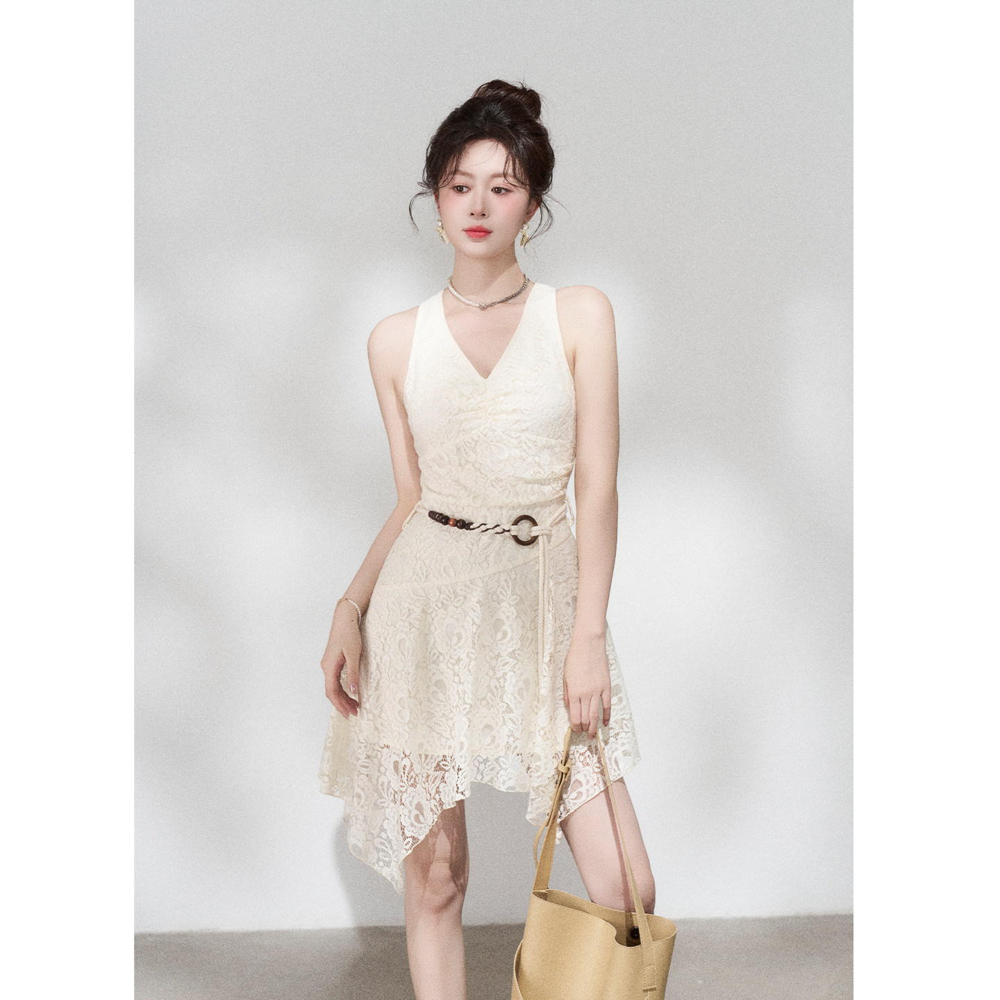311线报网描述:不规则杏色挂脖蕾丝连衣裙女夏季