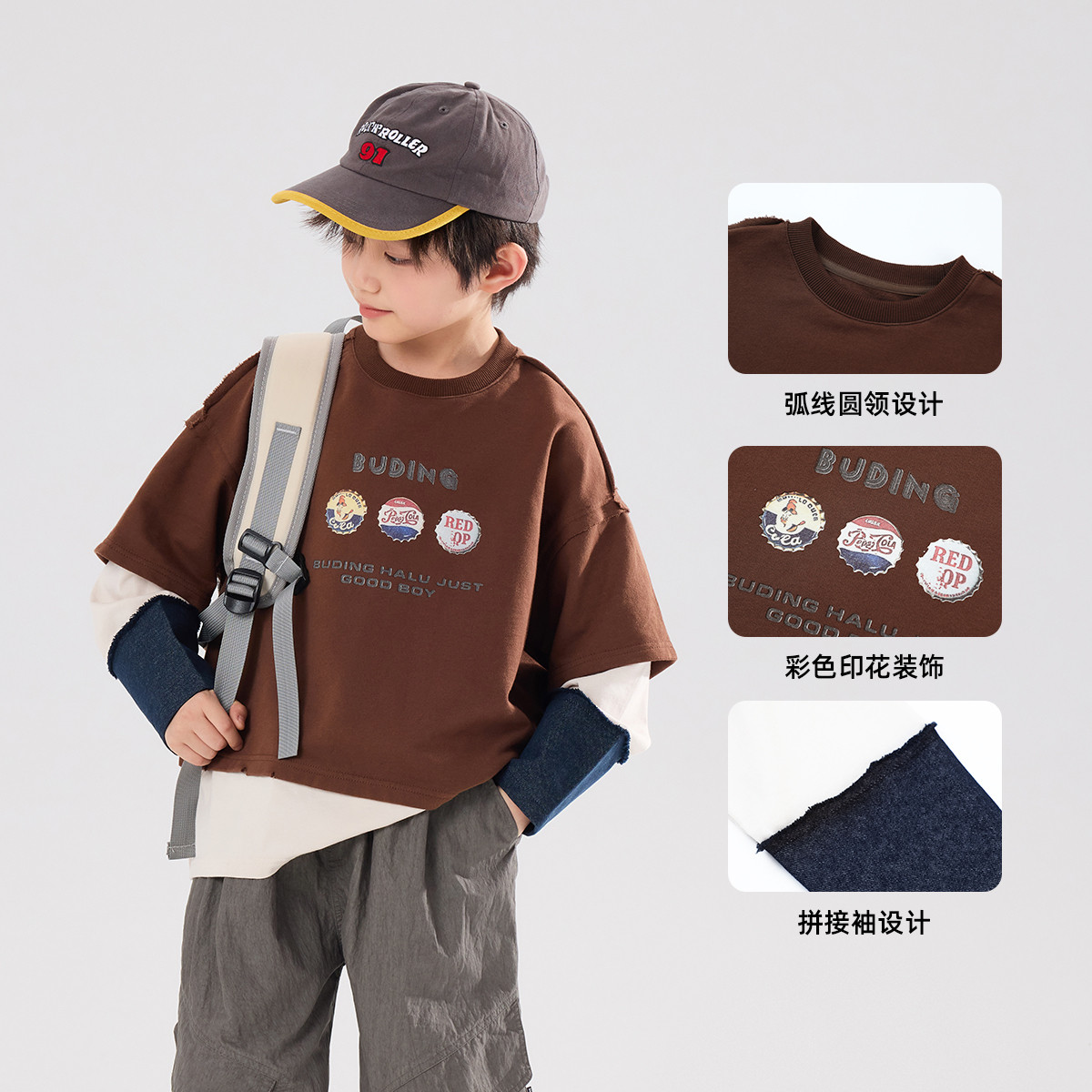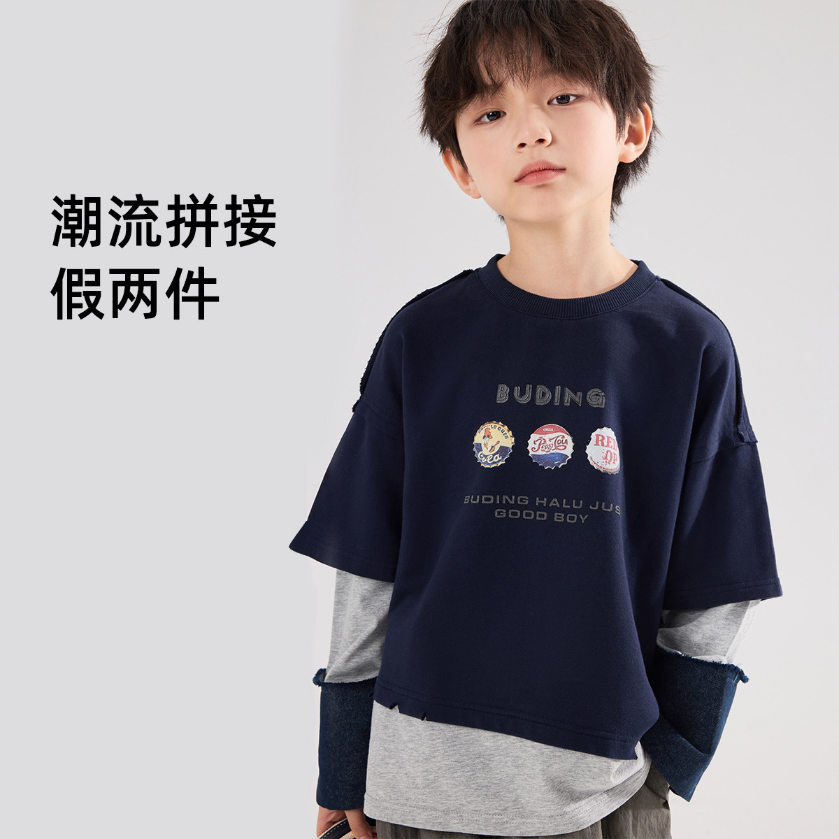 布丁哈鲁男童装洋气上衣2026春季新款儿童时尚拼接假两件T恤卫衣