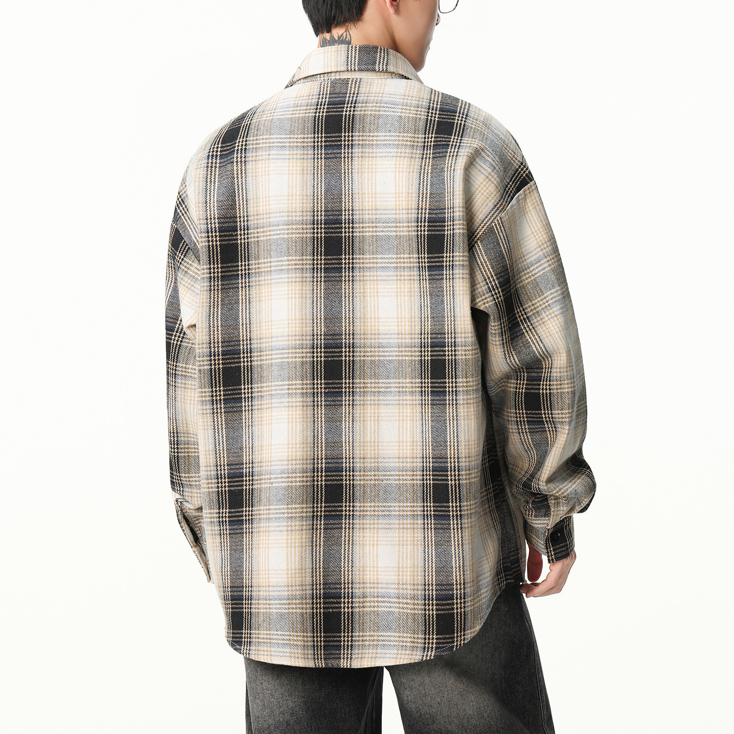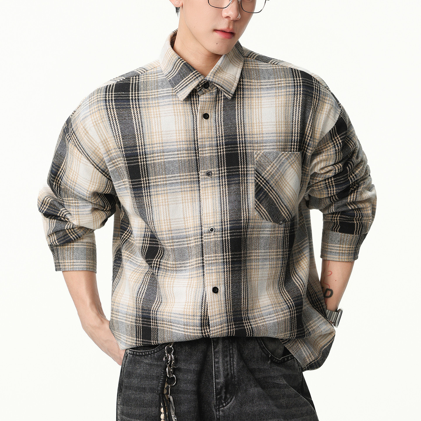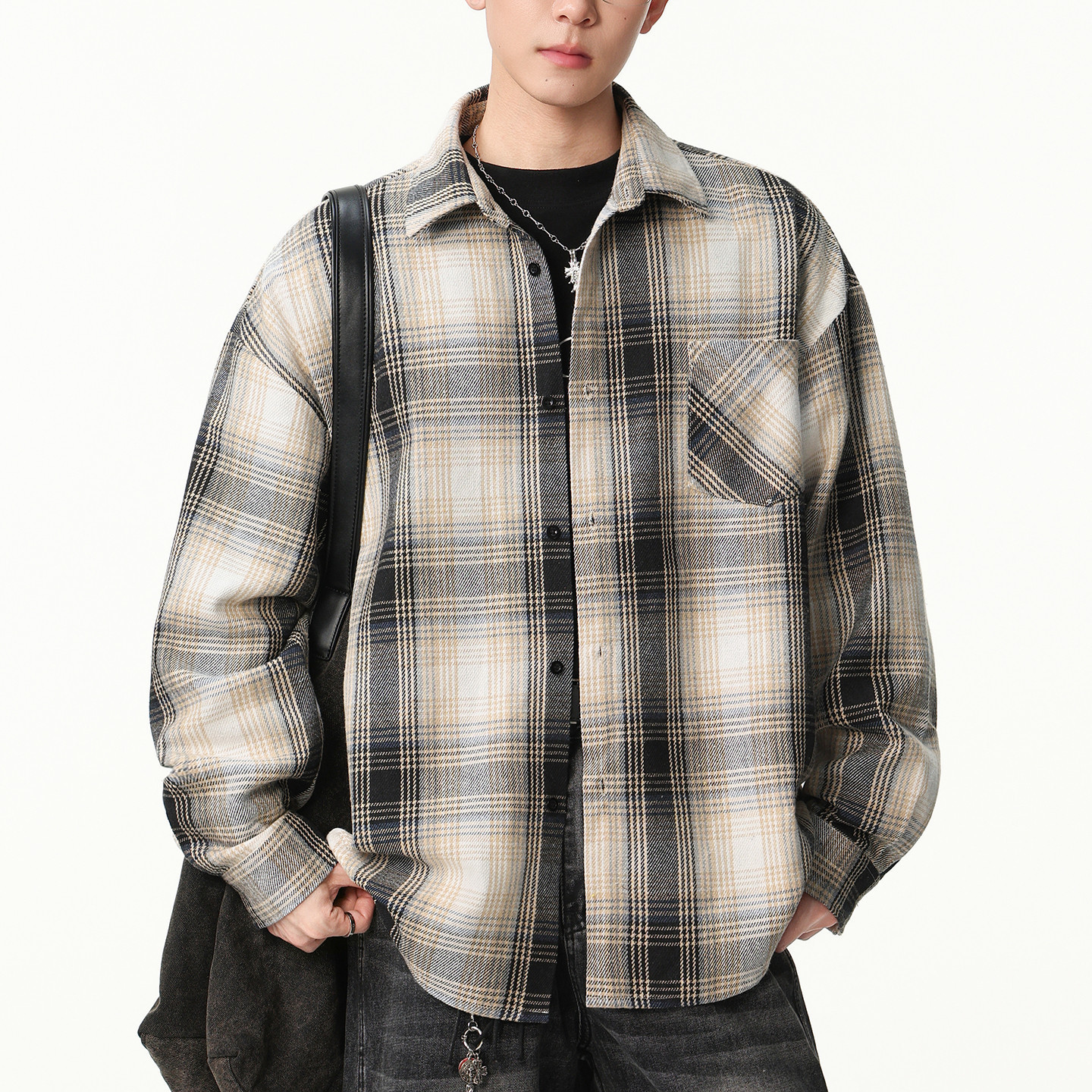 男士美式长袖格子衬衫男款春季宽松上衣2026新款衬衣外套大码男装