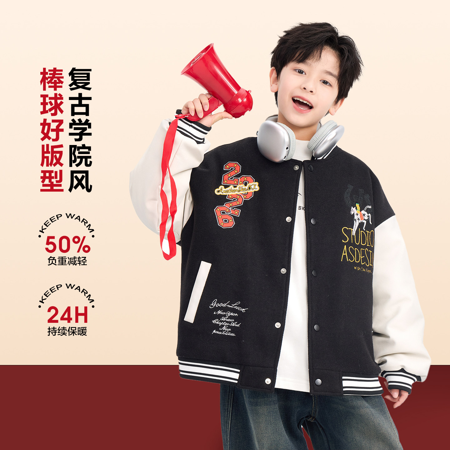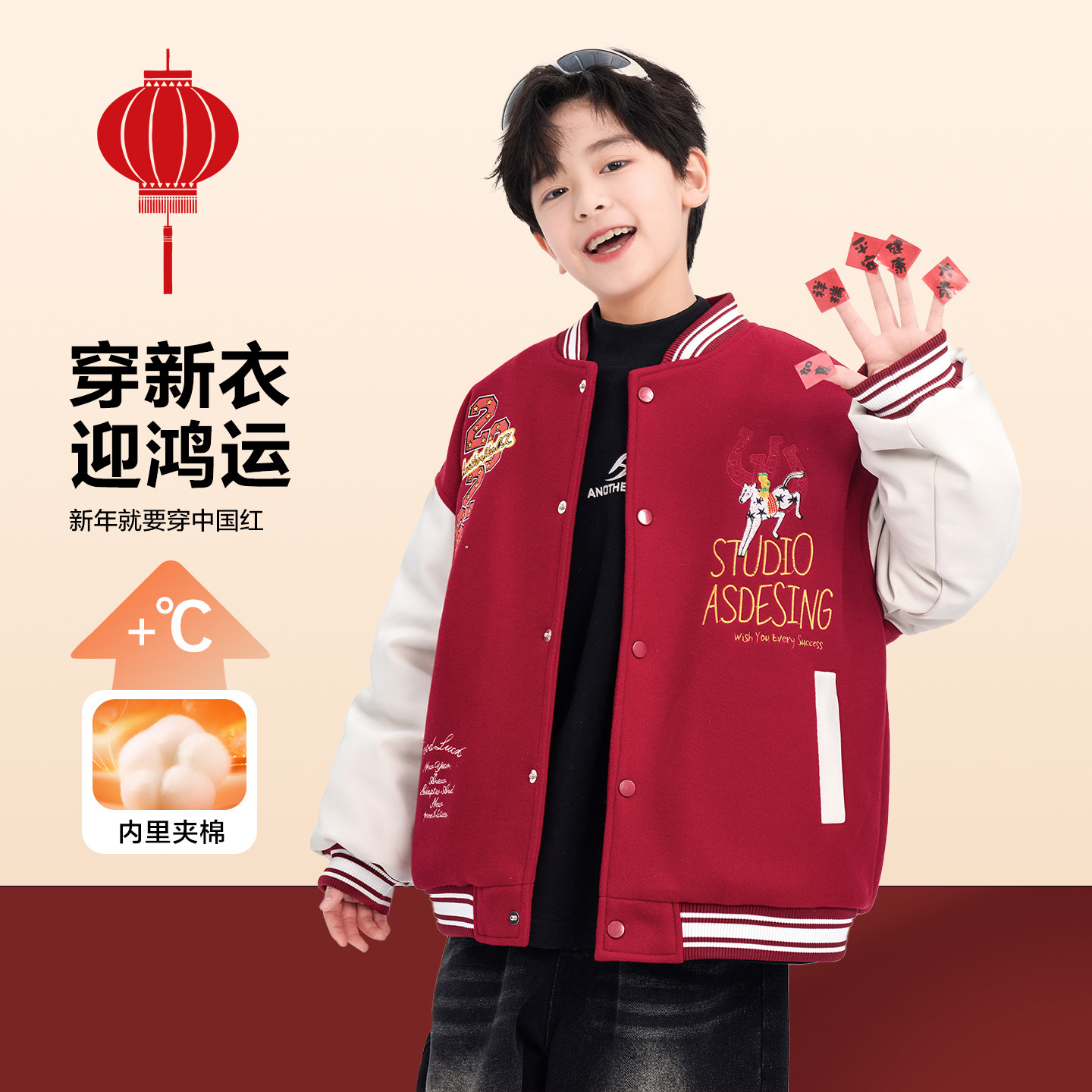 男童冬装马年红色新年棒球棉服2026新款儿童拜年拼接皮衣夹棉外套