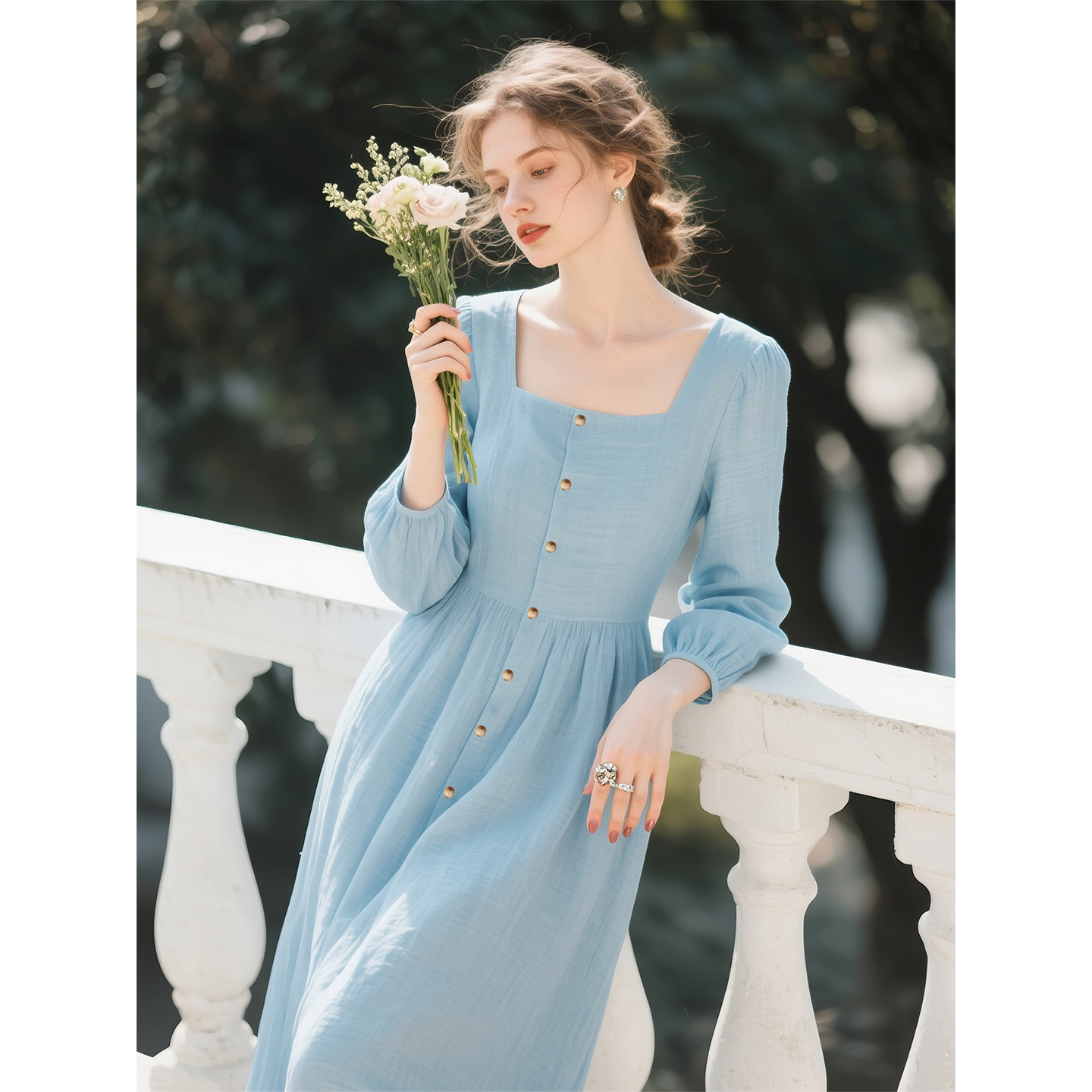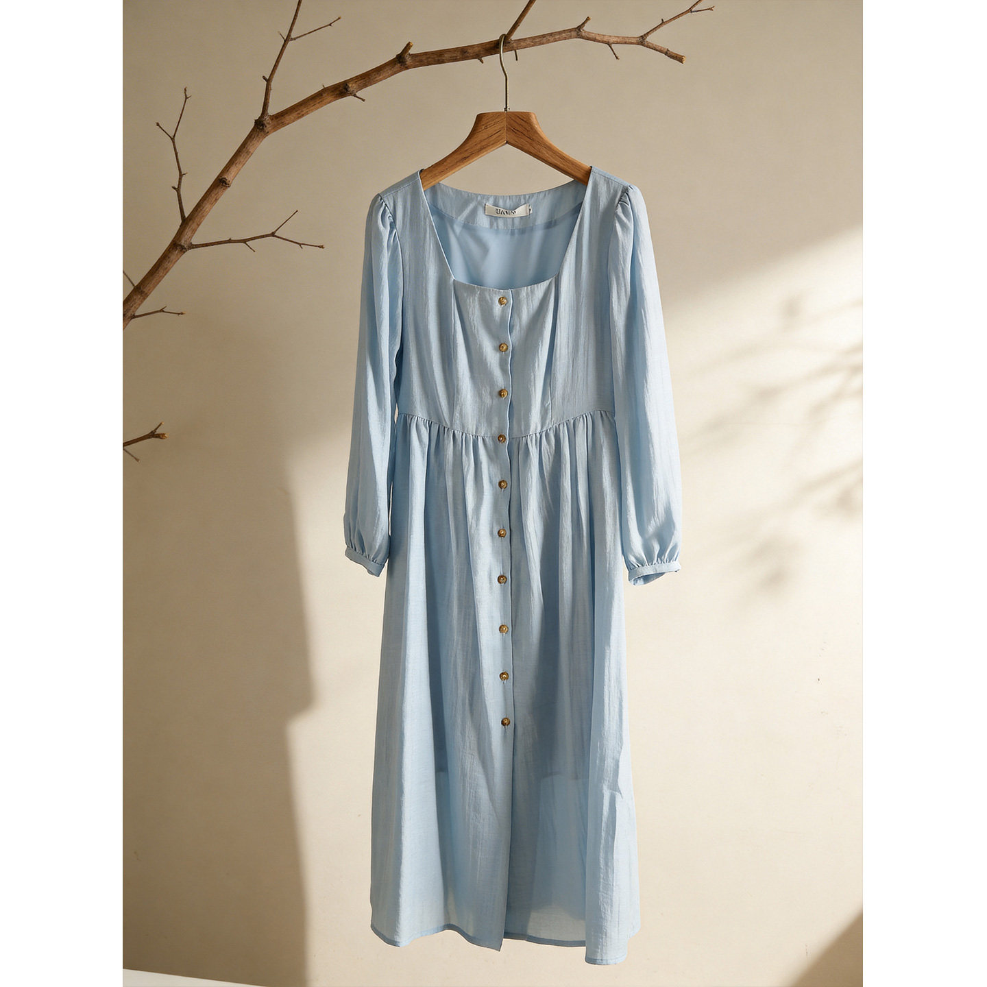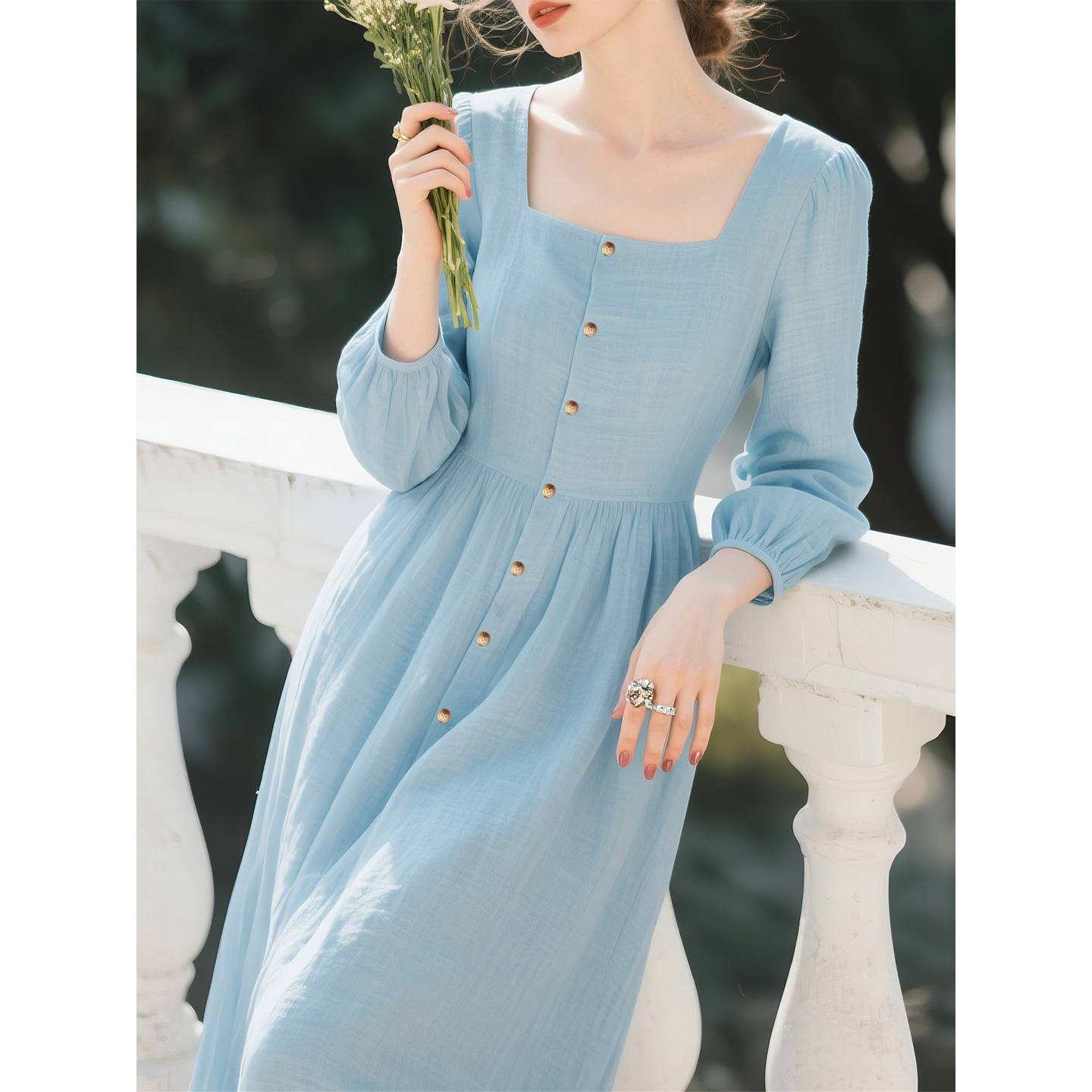 蓝色方领长袖连衣裙女2026年春季新款巨好看的气质收腰显瘦裙子