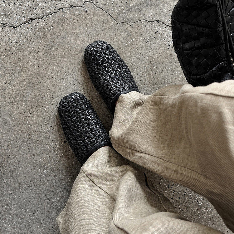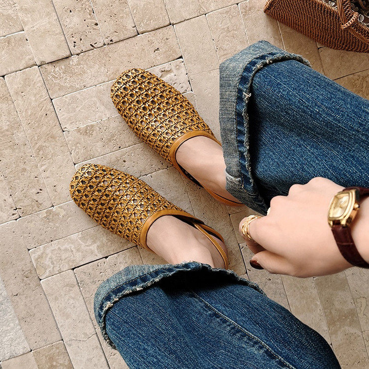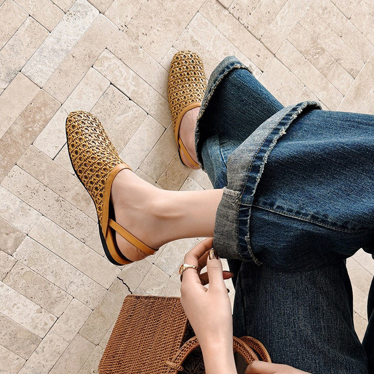 法式镂空编织包头凉鞋女平底透气后绊带米白色圆头夏天百搭女鞋子