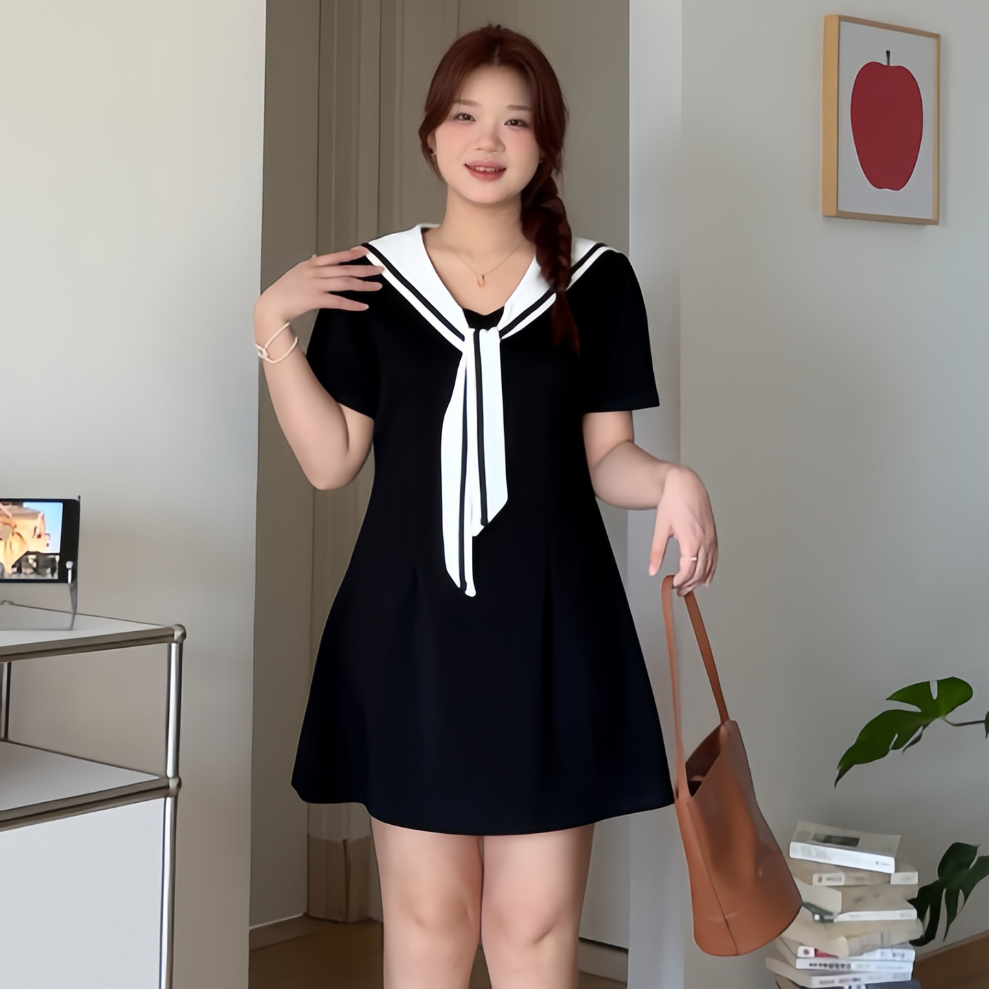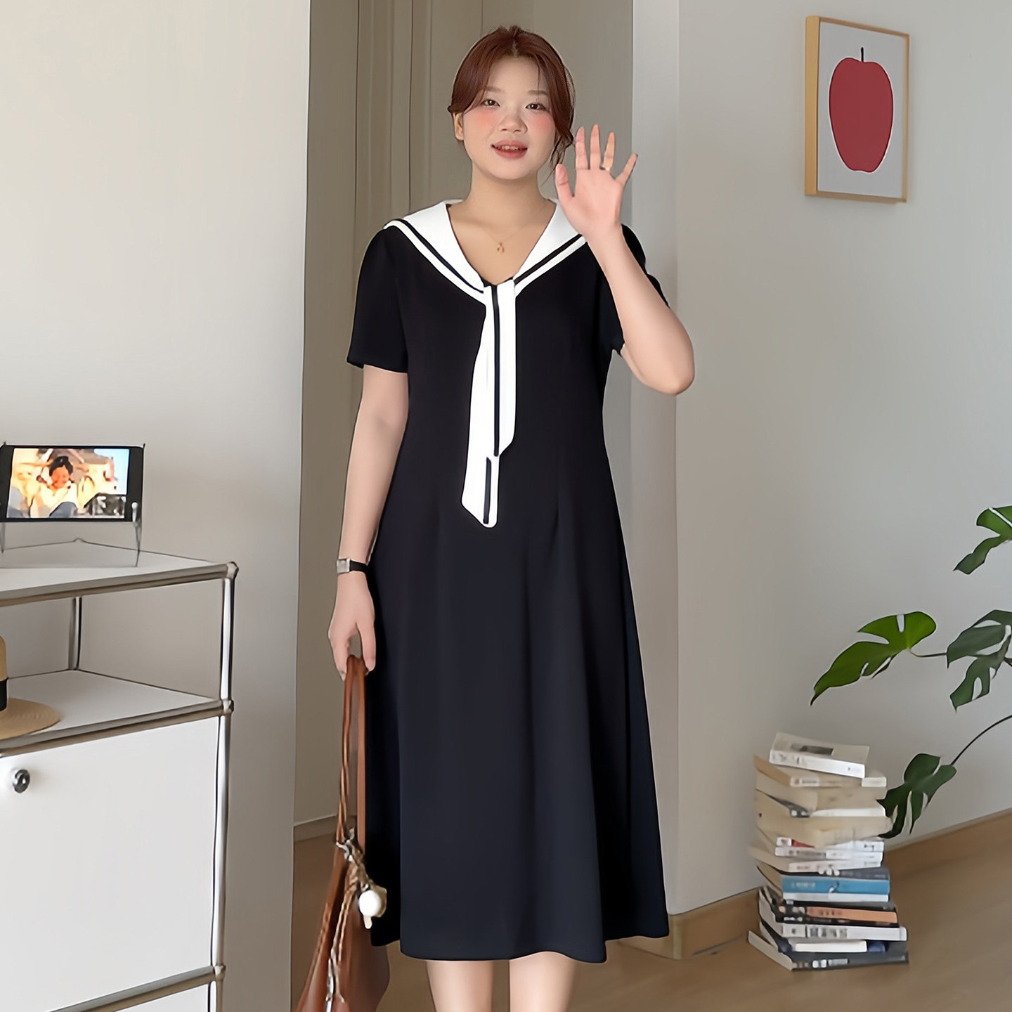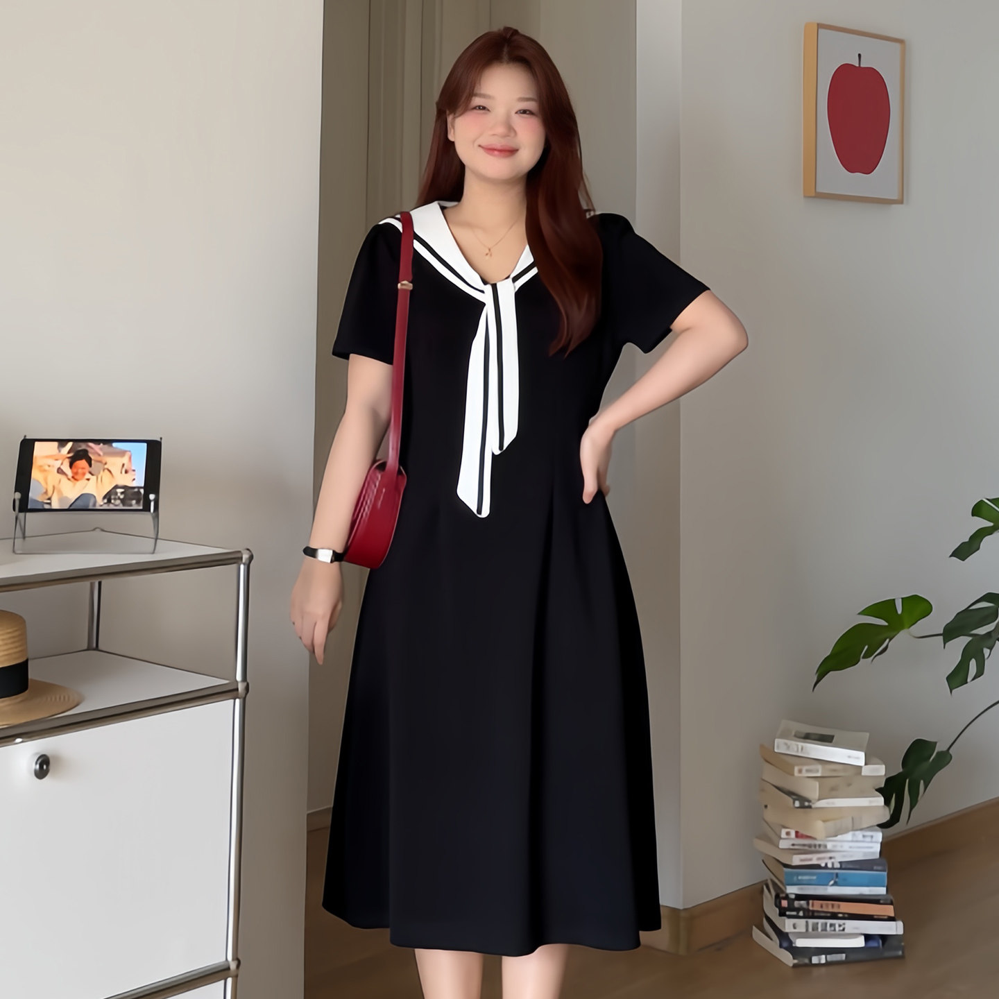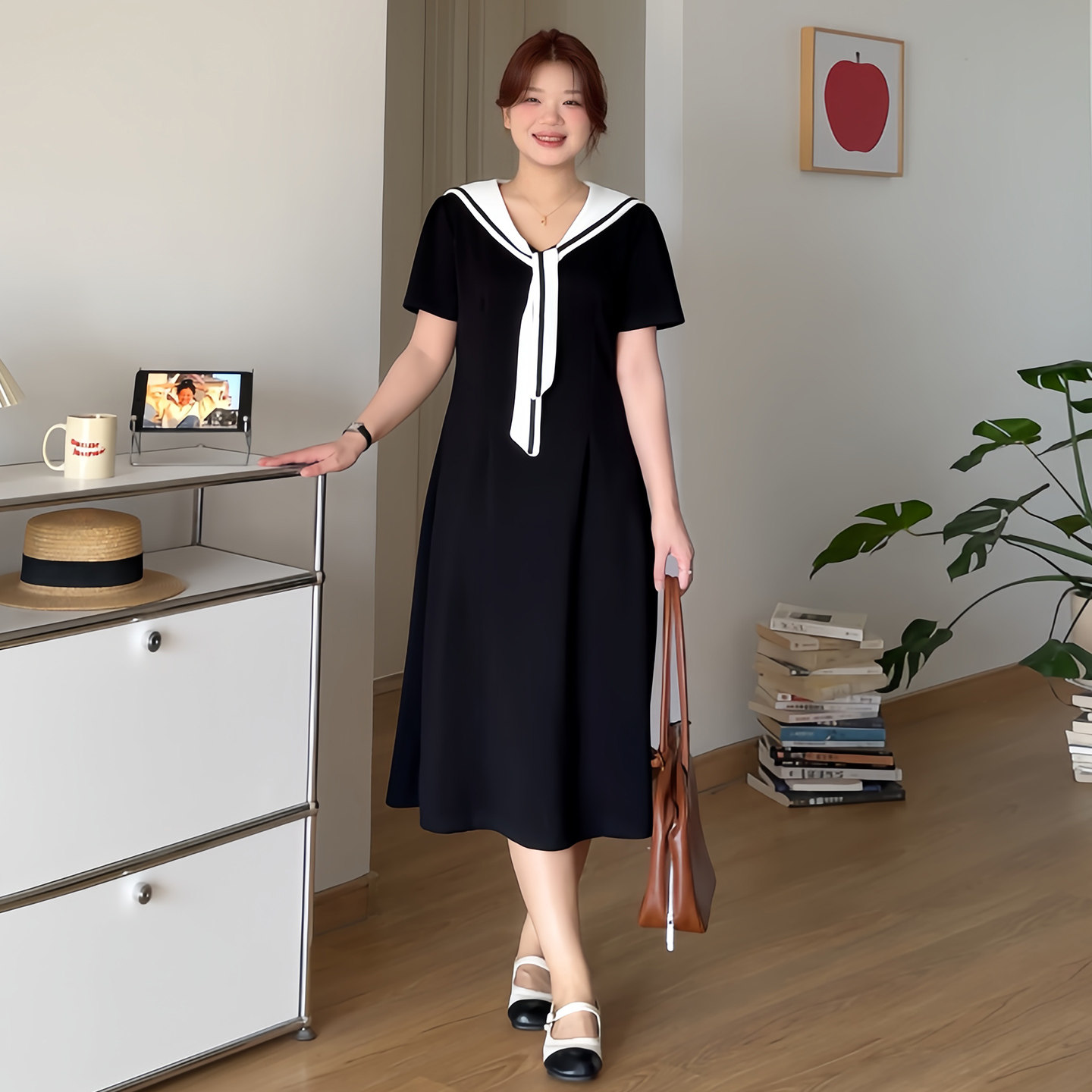 微胖的喵喵大码女装胖mm夏日巨好看显瘦遮肚海军领撞色连衣裙3239