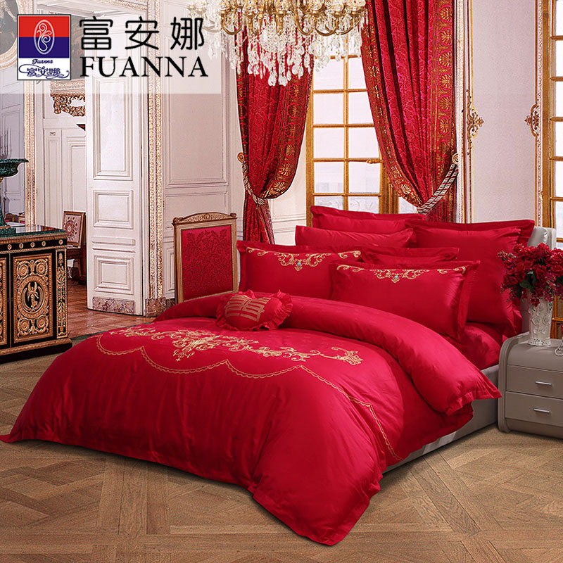 富安娜红色纯棉结婚四件套新婚大红六件套婚礼陪嫁婚庆床上全套装